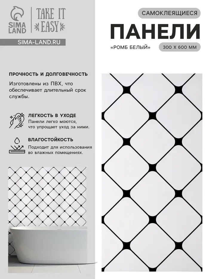 Стеновая панель самоклеящаяся TAKE IT EASY «Ромб», 300×600 мм, цвет белый, 10 шт.
