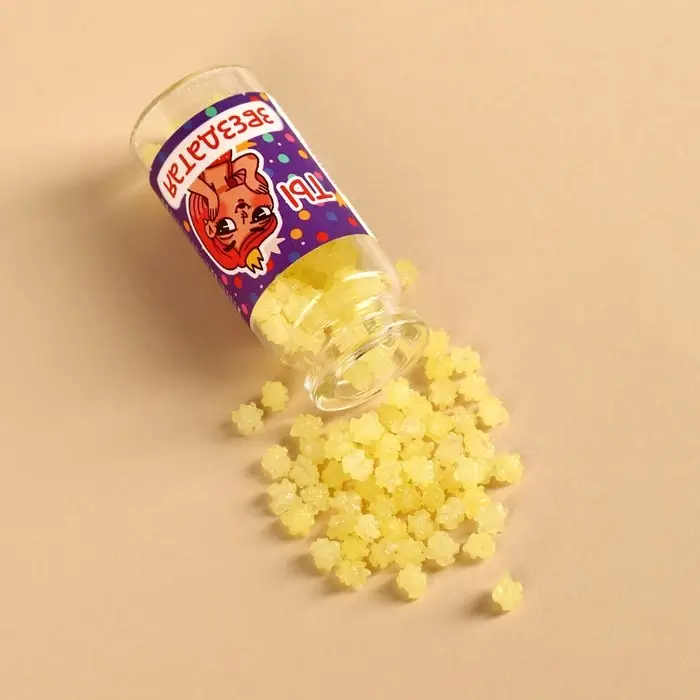 Состав: сахарный песок, пищевые добавки: ароматизаторы (белые фруктовый, желтые - лимон, голубые - черника, розовые - клубника, зеленые - яблоко, оранжевые - апельсин, светло-розовые - роза), красители (Е129, Е110, Е133, Е102).