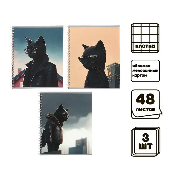 Комплект тетрадей из 3 штук, 48 листов в клетку на гребне Calligrata "Чёрный Кот", обложка мелованный картон, ВД-лак, блок офсет
