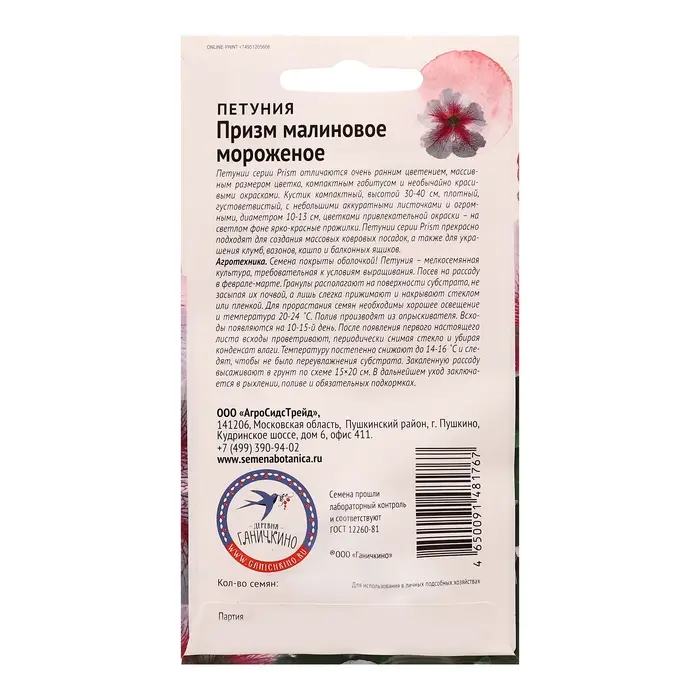 Растение компактное, высотой 35 см. Цветки очень крупные, диаметром 12 см, густомахровые, эффектной окраски – пурпурной с белой каймой. Цветение продолжительное, обильное. Гибрид устойчив к неблагоприятным условиям произрастания. Используется для оформления клумб, вазонов, кашпо и балконных ящиков. Агротехника: Семена покрыты оболочкой! Петуния – мелкосемянная культура, требовательная к условиям выращивания. Посев на рассаду в феврале-марте. Гранулы располагают на поверхности субстрата, не засыпая их почвой, а лишь слегка прижимают и накрывают стеклом или пленкой. Для прорастания семян необходимо хорошее освещение и температура 20-24˚С. Полив производят из опрыскивателя. Всходы появляются на 10-15 день. После появления первого настоящего листа всходы проветривают, периодически снимая стекло и убирая конденсат влаги. Температуру постепенно снижают до 14-16˚С и следят, чтобы не было переувлажнения субстрата. Закаленную рассаду высаживают в грунт по схеме 15×20 см. В дальнейшем уход заключается в рыхлении, поливе и подкормах.