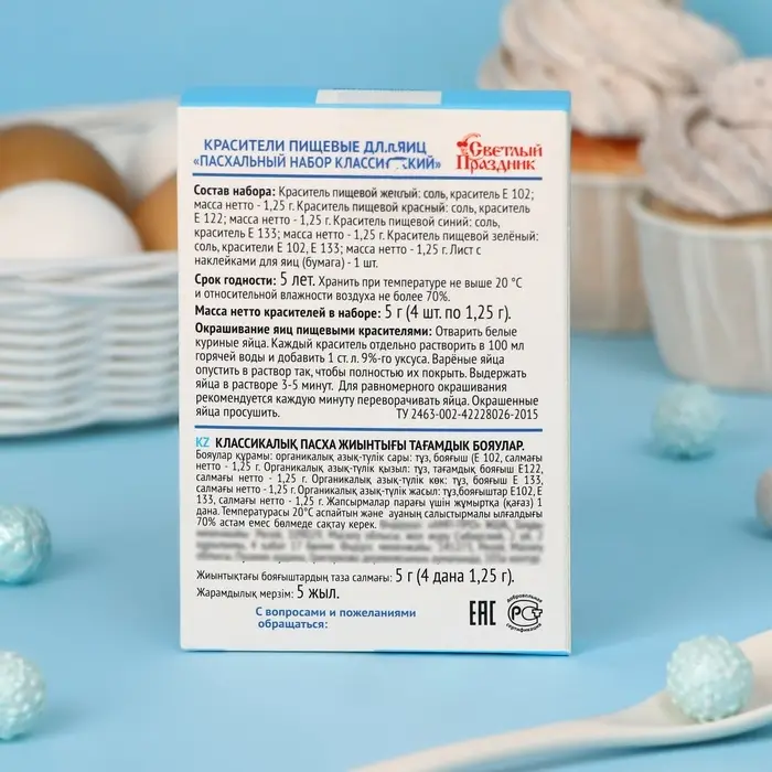 Краситель пищевой жёлтый: соль, краситель Е102; масса нетто - 1,25 г. Краситель пищевой красный: соль, краситель Е122; масса нетто - 1,25 г. Краситель пищевой синий: соль, краситель Е 133; масса нетто - 1,25 г. Краситель пищевой зелёный: соль, красители Е102, Е133; масса нетто - 1,25 г. Лист с наклейками для яиц (бумага) - 1 шт.