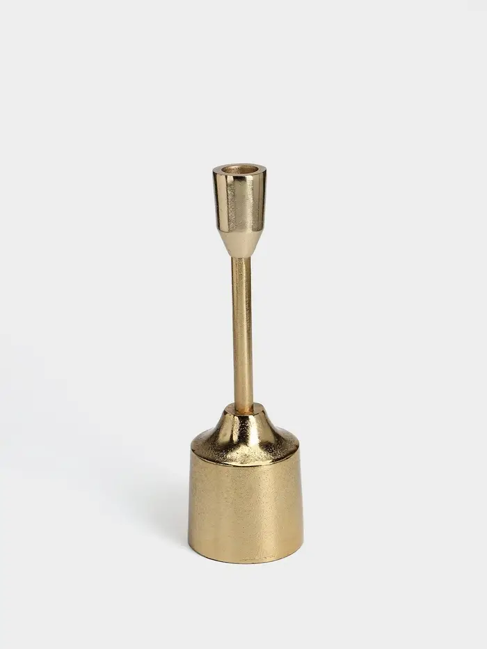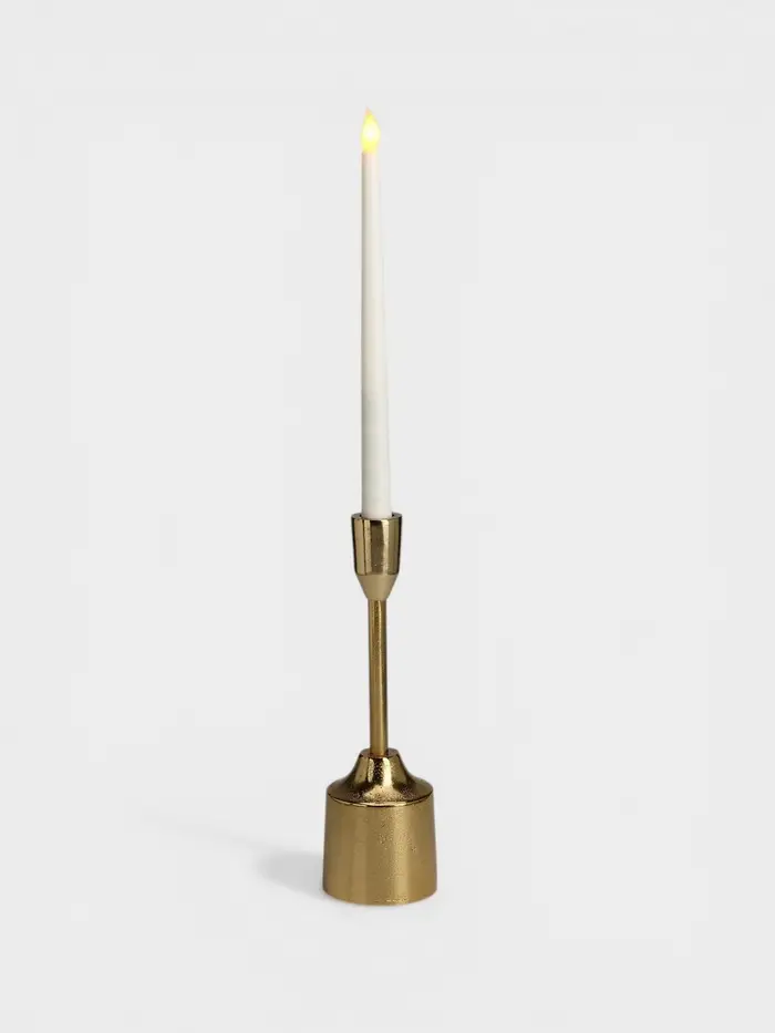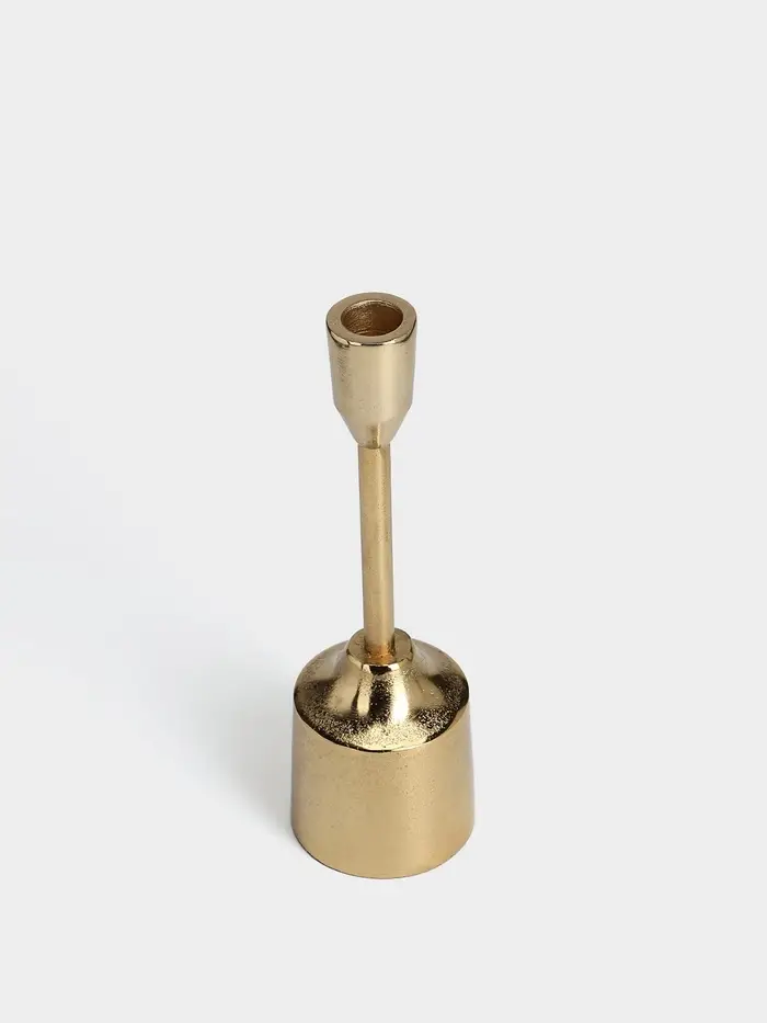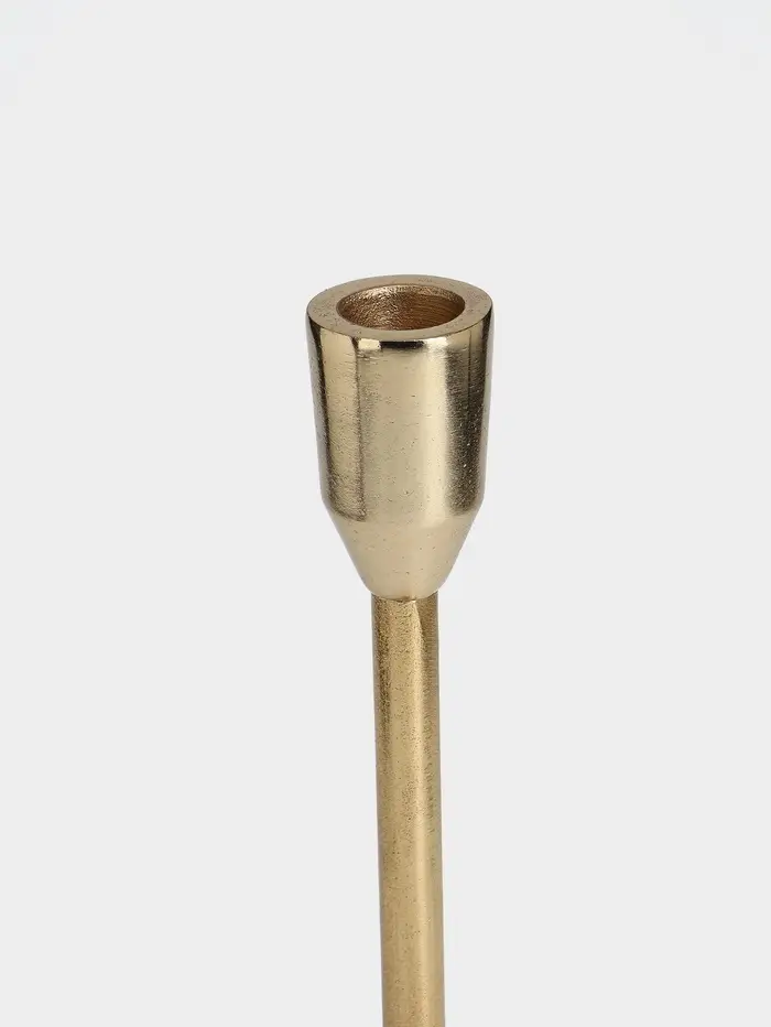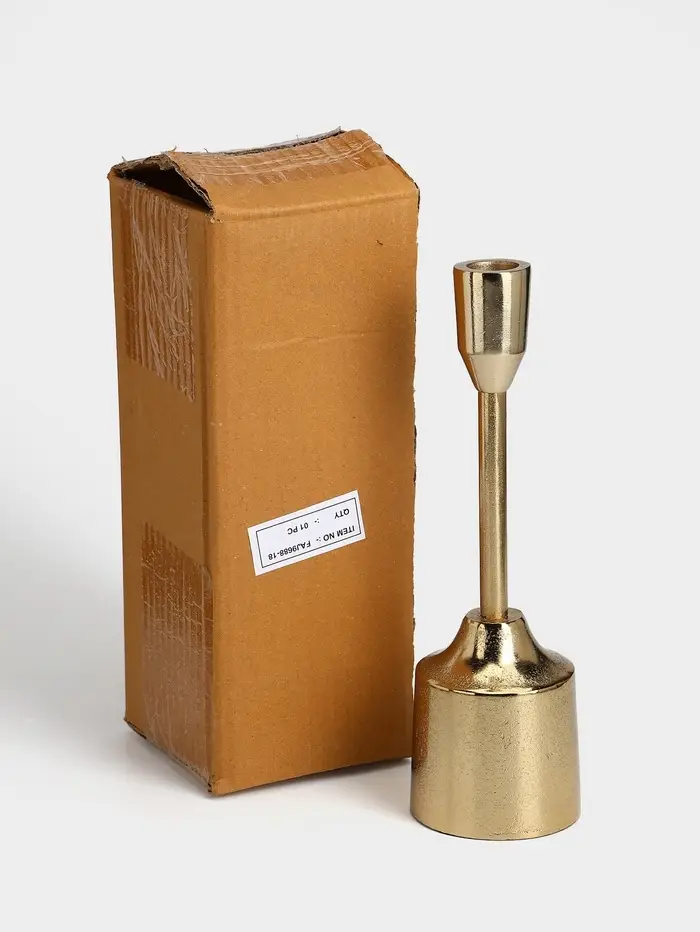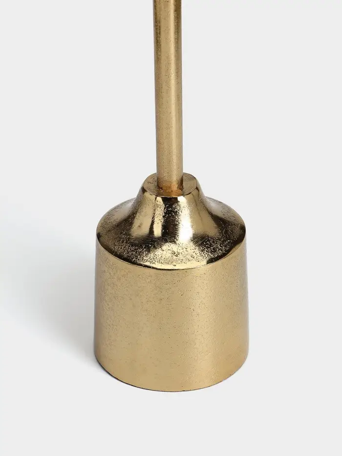 - Классическая форма из современного материала: Алюминий обеспечивает лёгкость и прочность. Золотистое покрытие придаёт теплоту металлу, создавая эффект патинированного благородного сплава. Подсвечник не боится времени и сохраняет вид.