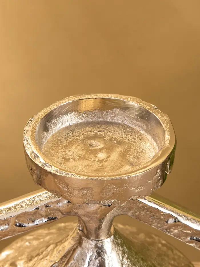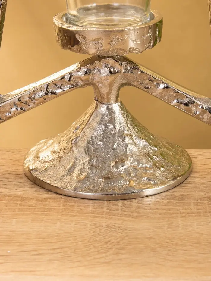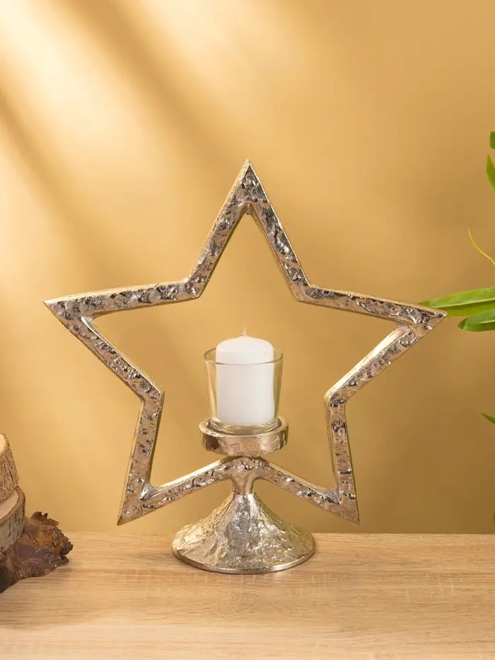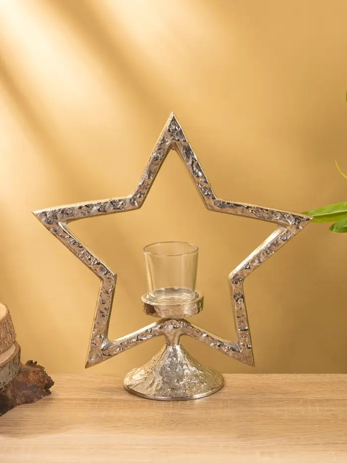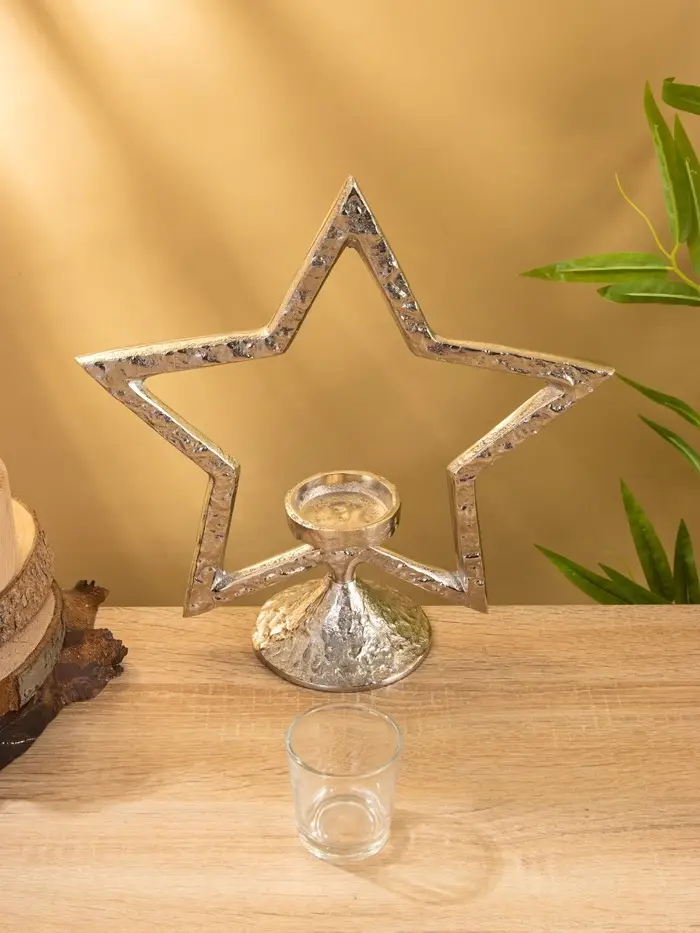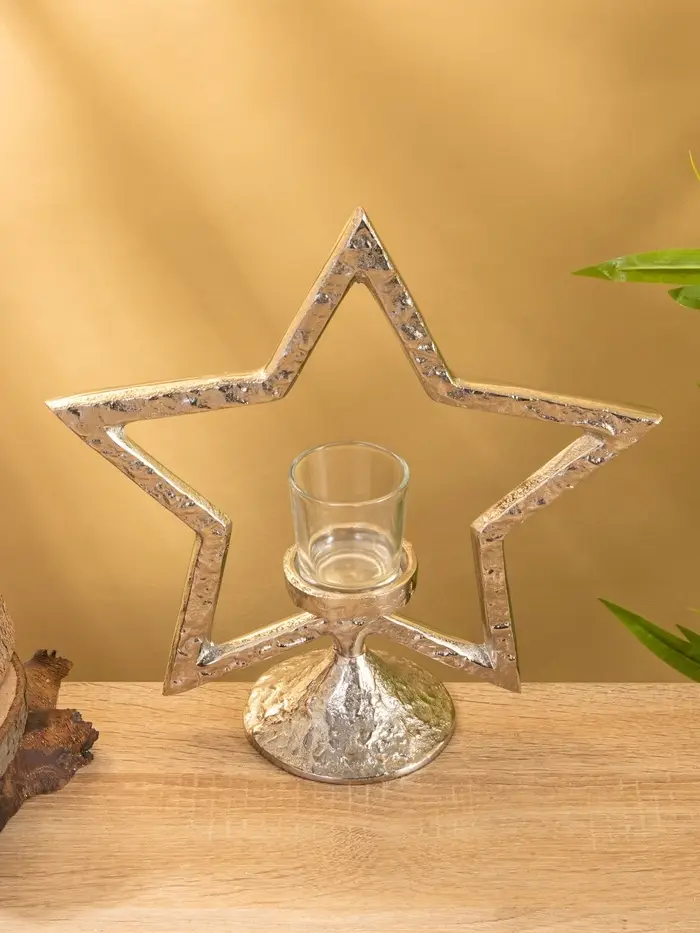 Подсвечник «Звезда» — не просто держатель для свечи, а архитектурный акцент, который создаёт атмосферу даже без праздника. Его высота 29,5 см и стройная форма делают его заметным, но не громоздким. Серебристый алюминий отражает свет, не отвлекая от пламени, а геометрия звезды добавляет современный ритм интерьеру.