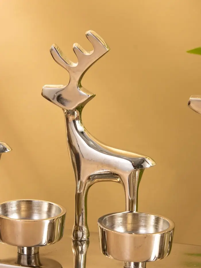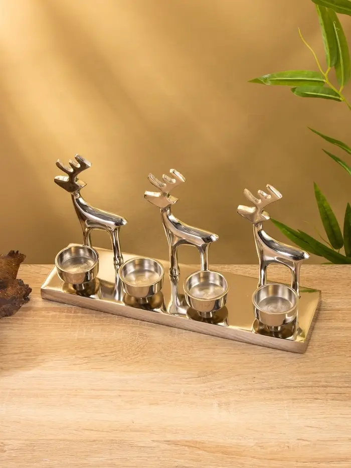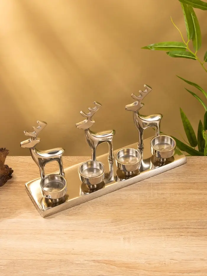 Вы ставите свечи, зажигаете их вечером — и тени оленей мягко ложатся на стену. Пламя горит ровно, алюминий не нагревается, композиция остаётся устойчивой. Подсвечник не требует особого оформления: он сам создаёт настроение. Используйте его на новогоднем столе, в гостиной или как центр композиции на полке — он работает и как символ праздника, и как сдержанное украшение.
