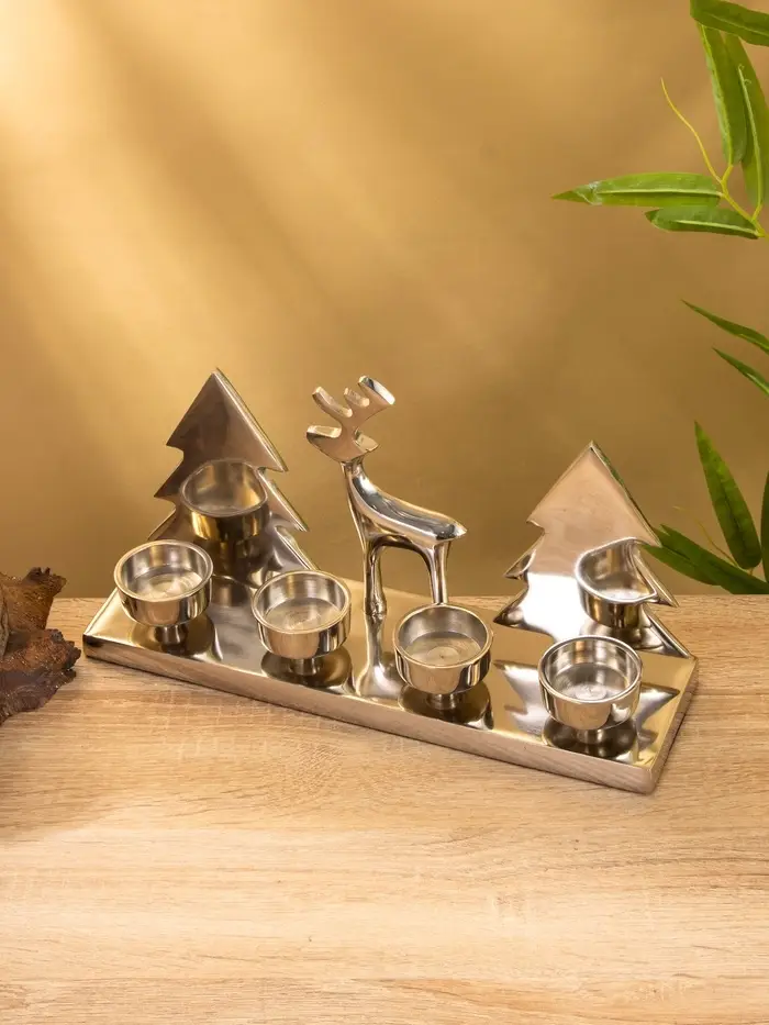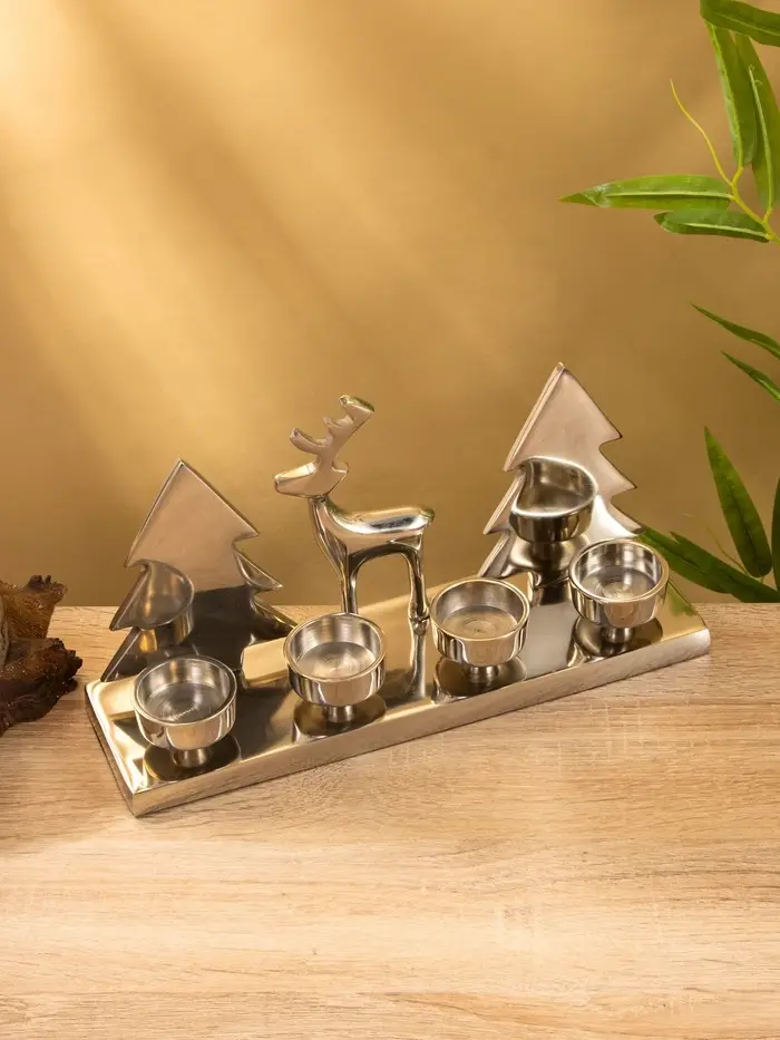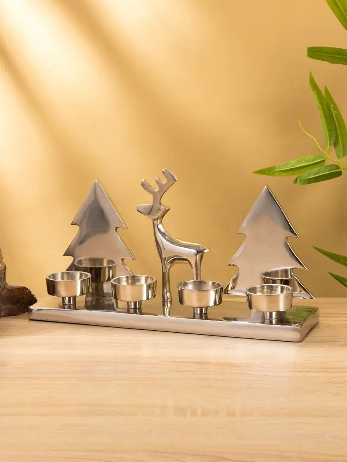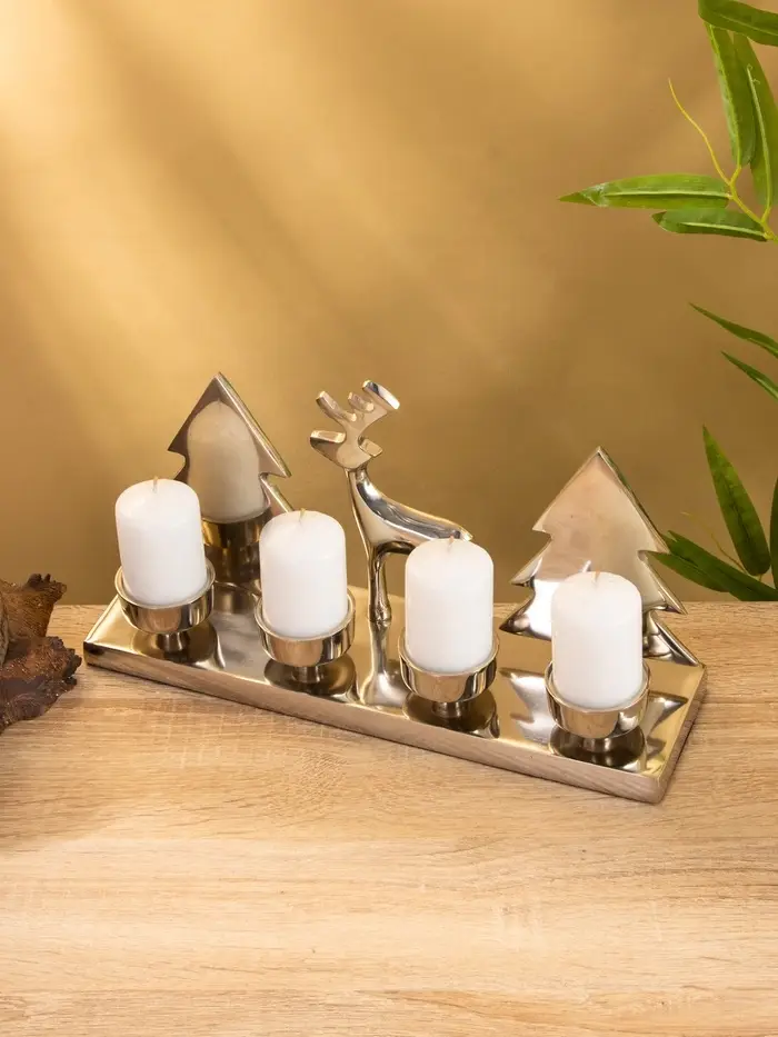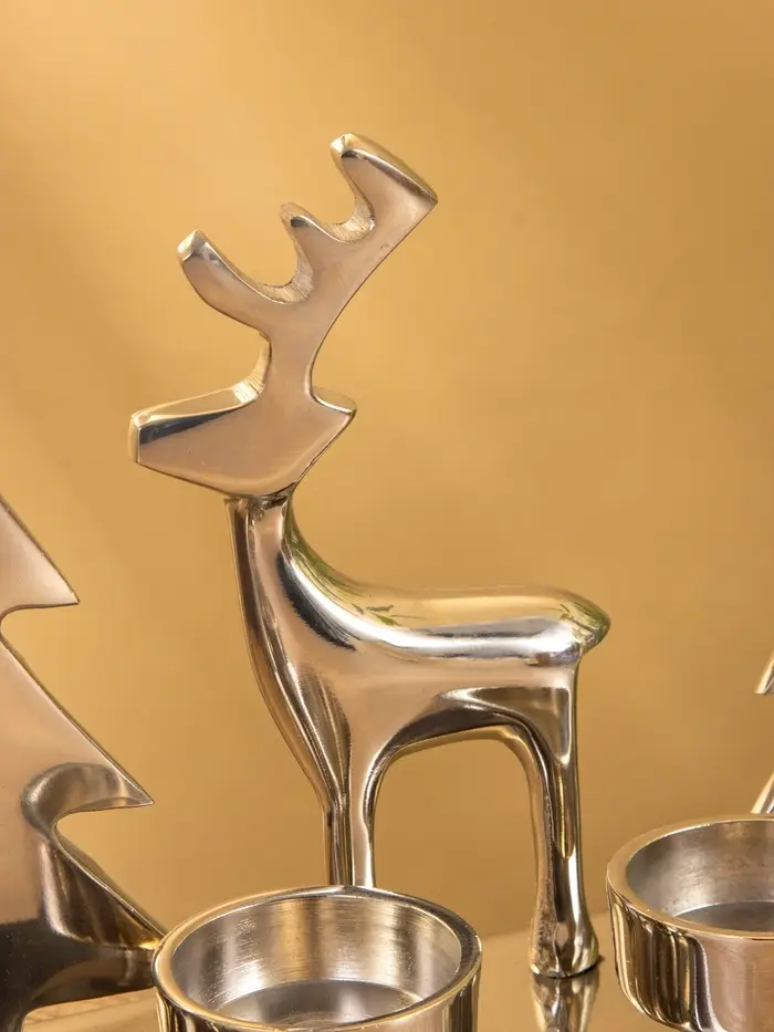 Вы ставите свечи, зажигаете их перед ужином или в тихий вечер — и тени Рудольфа с ёлками мягко ложатся на стену. Пламя горит ровно, алюминий остаётся прохладным, композиция устойчива. Подсвечник не кричит “праздник!”, но создаёт настроение — как старая добрая сказка, которую знаешь наизусть, но всё равно хочется слушать.