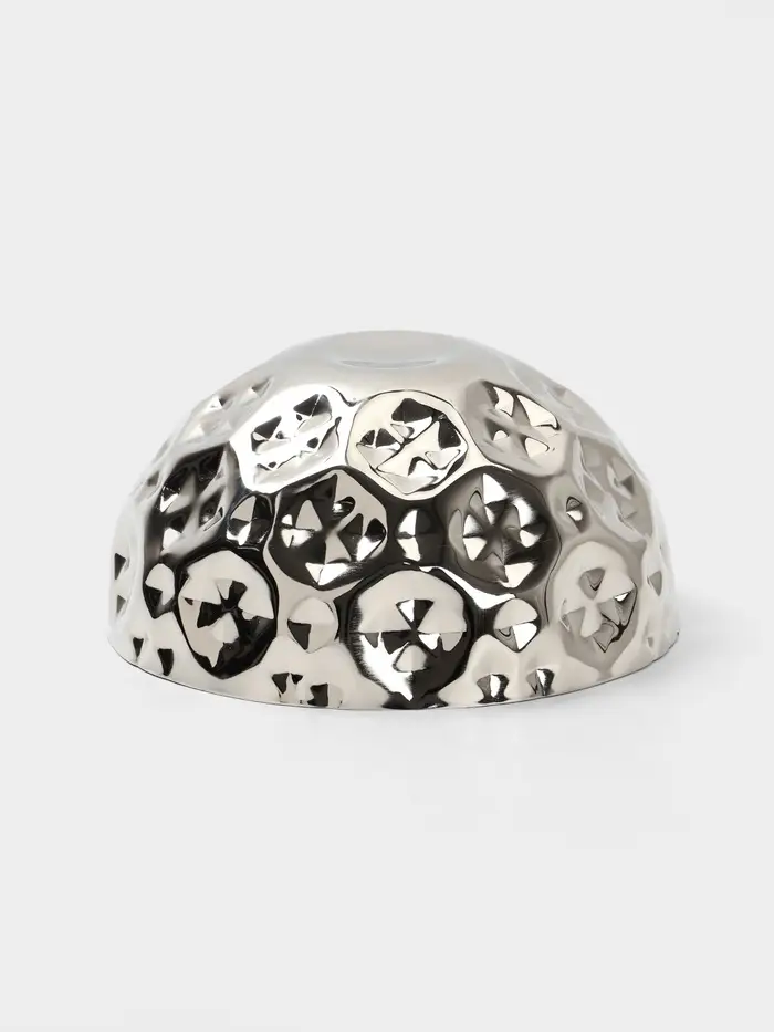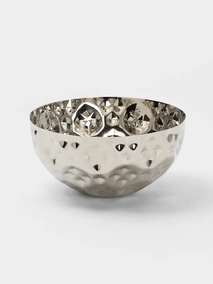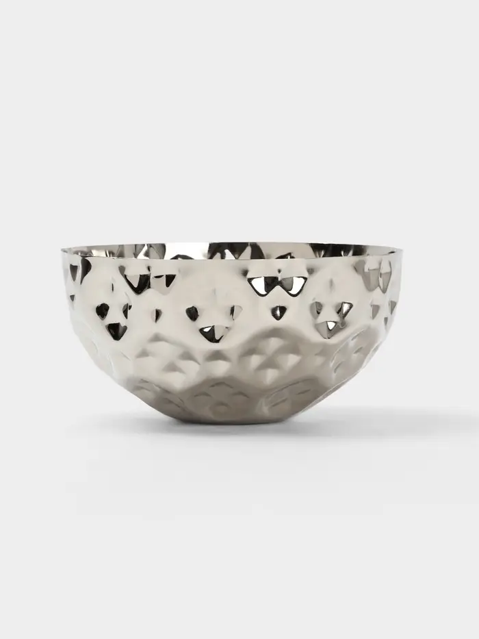 Гранёная миска из нержавеющей стали. Вместимость 3,5 литра, диаметр 25 см. Классический серебристый цвет с рельефной поверхностью. Универсальная посуда для кухни и сервировки.