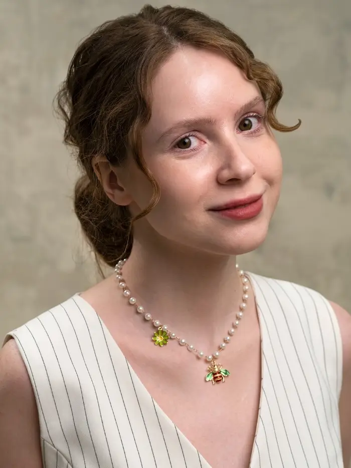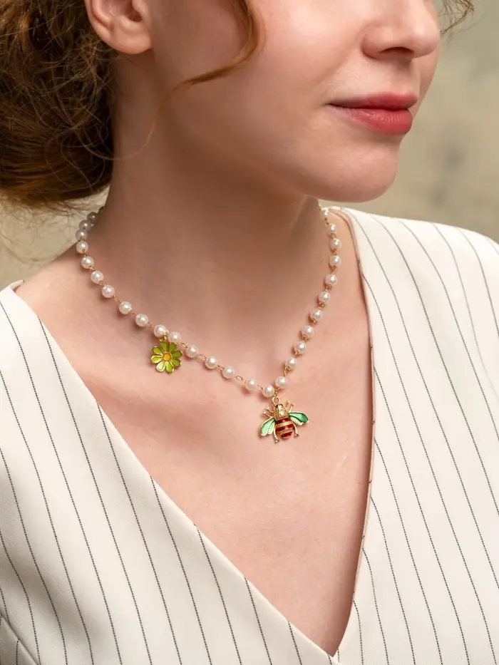Представьте себе нежное колье, где жемчужные бусины диаметром 6 мм выстраиваются в изящную дорожку длиной 40 см, дополненную золотистой фурнитурой и очаровательной подвеской в виде пчелки — этот аксессуар воплощает лёгкость и игривость, идеально подходящий для тех, кто хочет добавить нотку природы и веселья в свой образ.