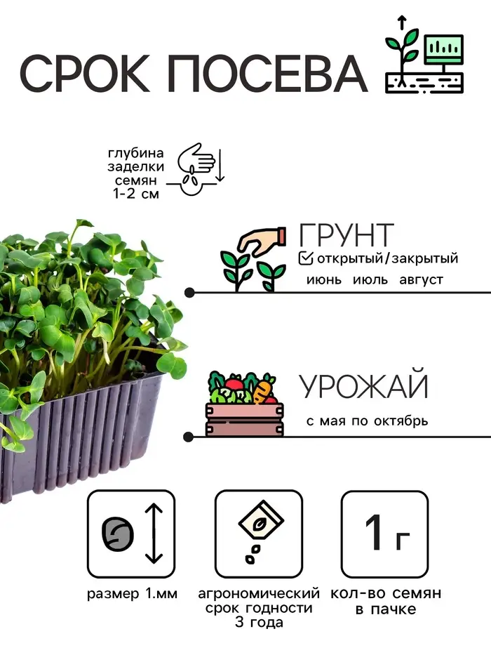 - Быстрый срок созревания — всего 10–12 дней, что позволяет наслаждаться свежей зеленью практически сразу;