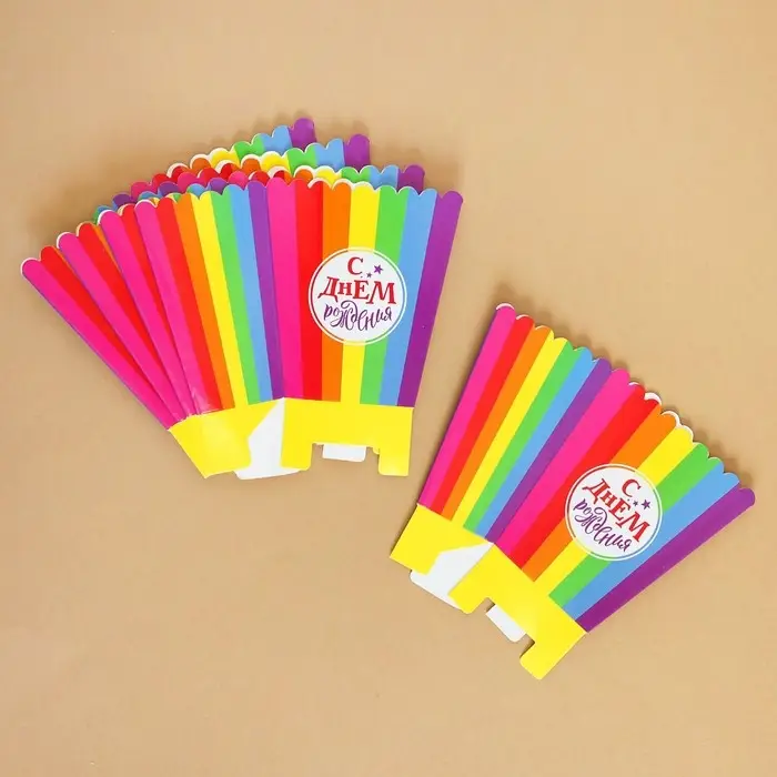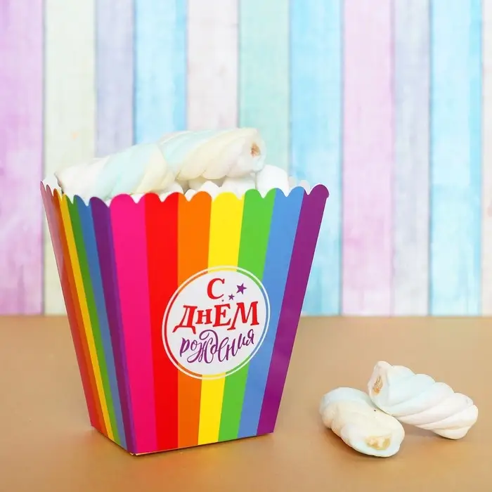 Стакан для попкорна и снеков «С Днём Рождения!» — это отличный выбор для украшения праздничного стола. Наполните его различными сладостями — попкорном, печеньем, конфетами, зефиром. Это очень удобно, особенно для детского торжества: яркий дизайн непременно привлечёт внимание малышей. К тому же такая ёмкость абсолютно безопасна в использовании, и её легко утилизировать.