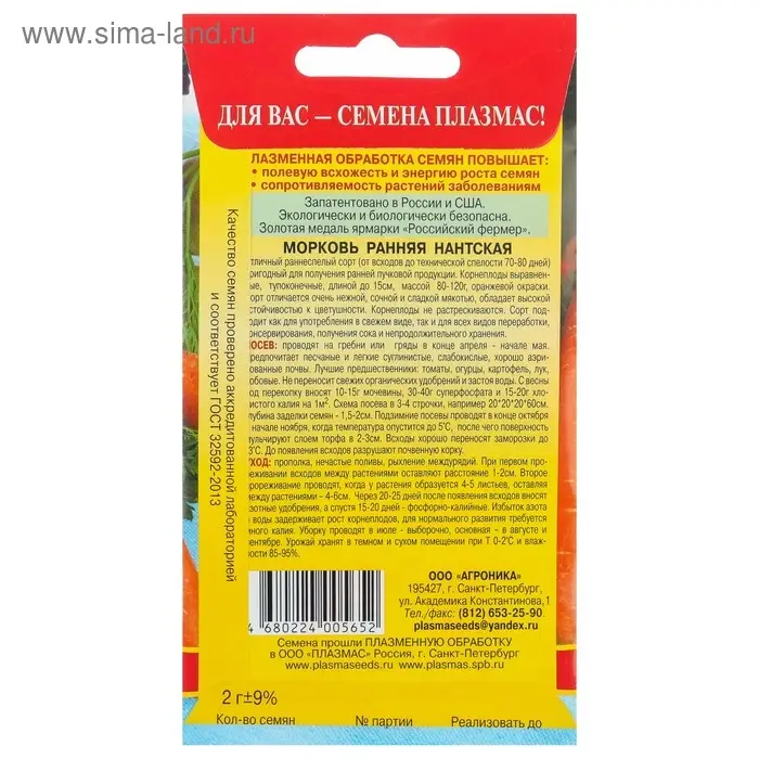 "Скороспелый сорт, от всходов до технической спелости 70-80 дней. Корнеплоды цилиндрические, тупоконечные, длиной 12-15 см, массой 80-120 г. Урожайность 4,5-5,5 кг/ м2. Мякоть оранжевая, сочная, нежная, сладкая. Сорт характеризуется устойчивостью к цветушности и растрескиванию корнеплодов. Универсального назначения – прекрасно подходит для домашней кулинарии, используется для получения ранней пучковой продукции, для всех видов консервирования и непродолжительного хранения.