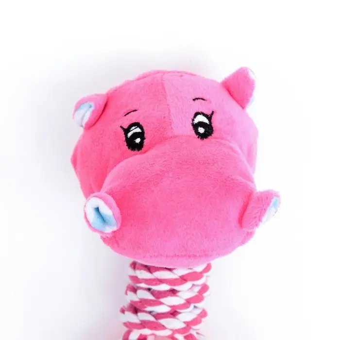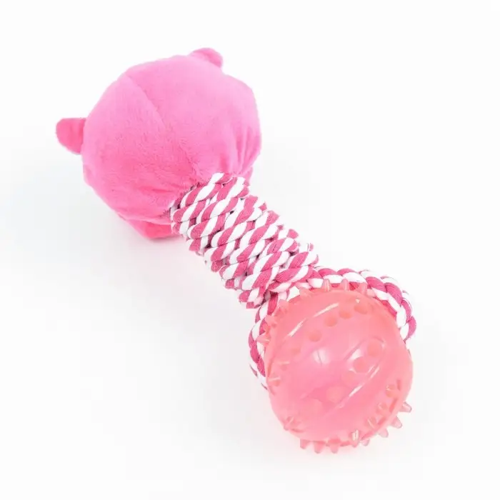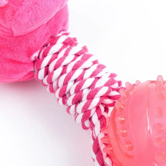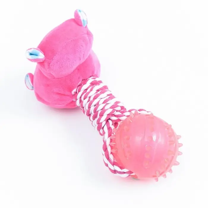 Игрушка для собак 3-в-1 "Бегемот": канатная, мягкая с пищалкой, мяч TPR, 20 см, розовая