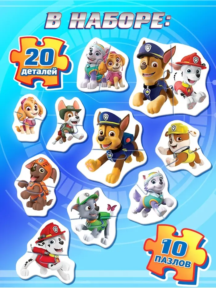 - В наборе 10 пазлов с изображением героев «Щенячьего патруля».