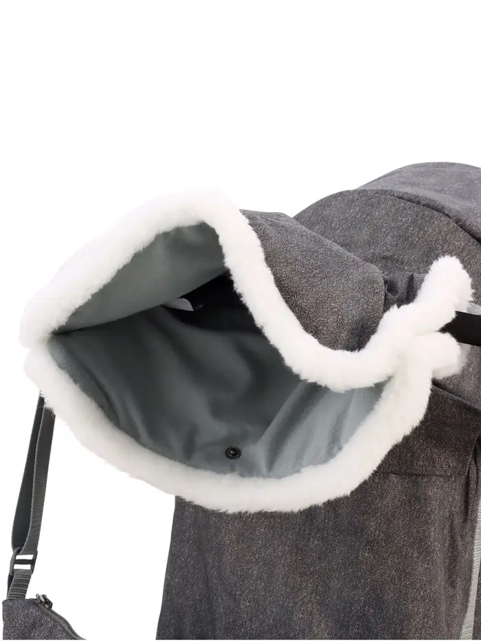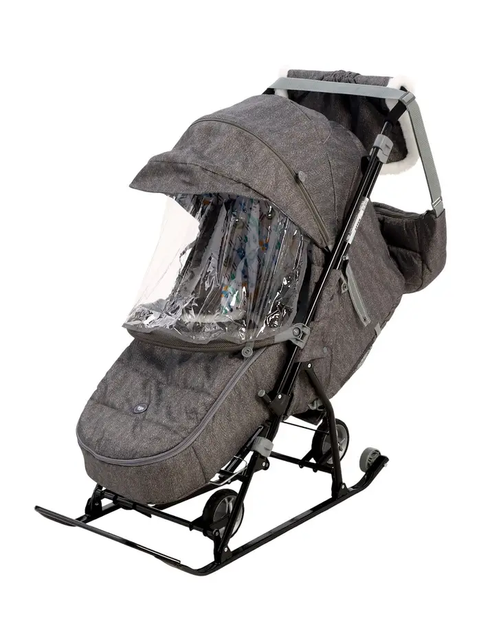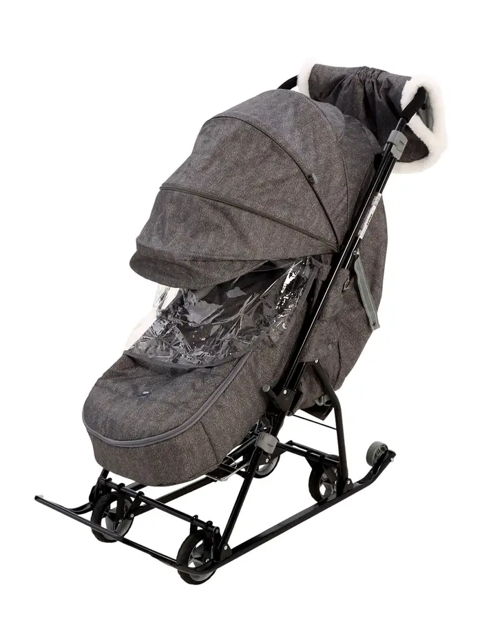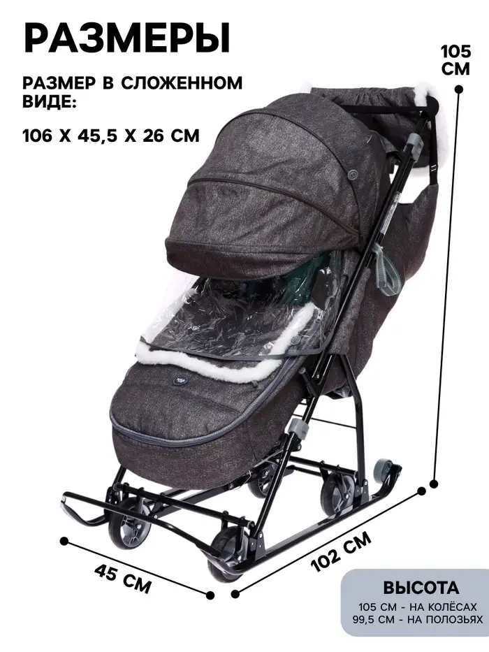 - В комплекте — муфта с меховой отделкой для рук родителей, сумка, съёмный чехол для ног с круговой молнией и прозрачный тент-дождевик.