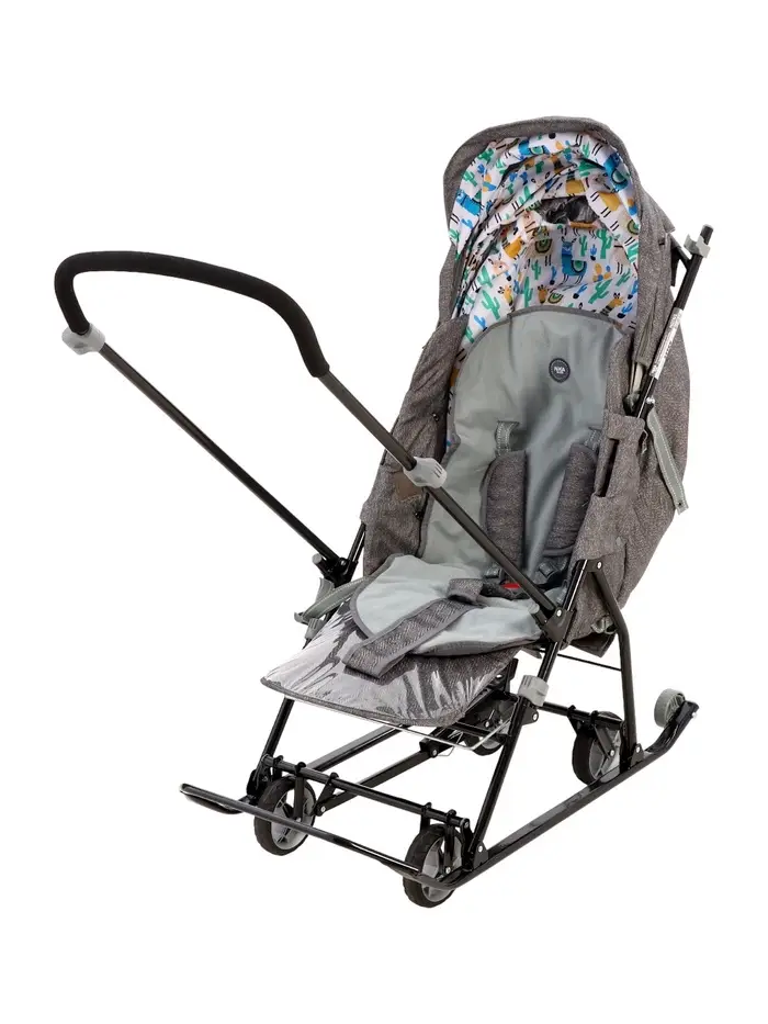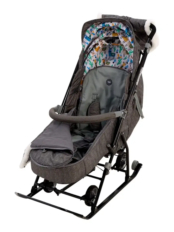 Санки-коляска с утеплённым чехлом и муфтой создана для долгих зимних прогулок. Ребёнок остаётся в тепле, а родители могут легко управлять санками благодаря эргономичной ручке. Привлекательный серый цвет и принт с ламой выделит ваши сани среди других — стильно и практично!