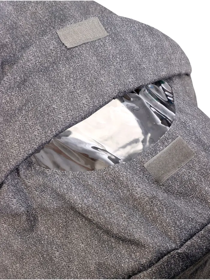- Четырёхсекционный козырёк и окошко добавляют удобства, одна секция застёгивается на молнию.