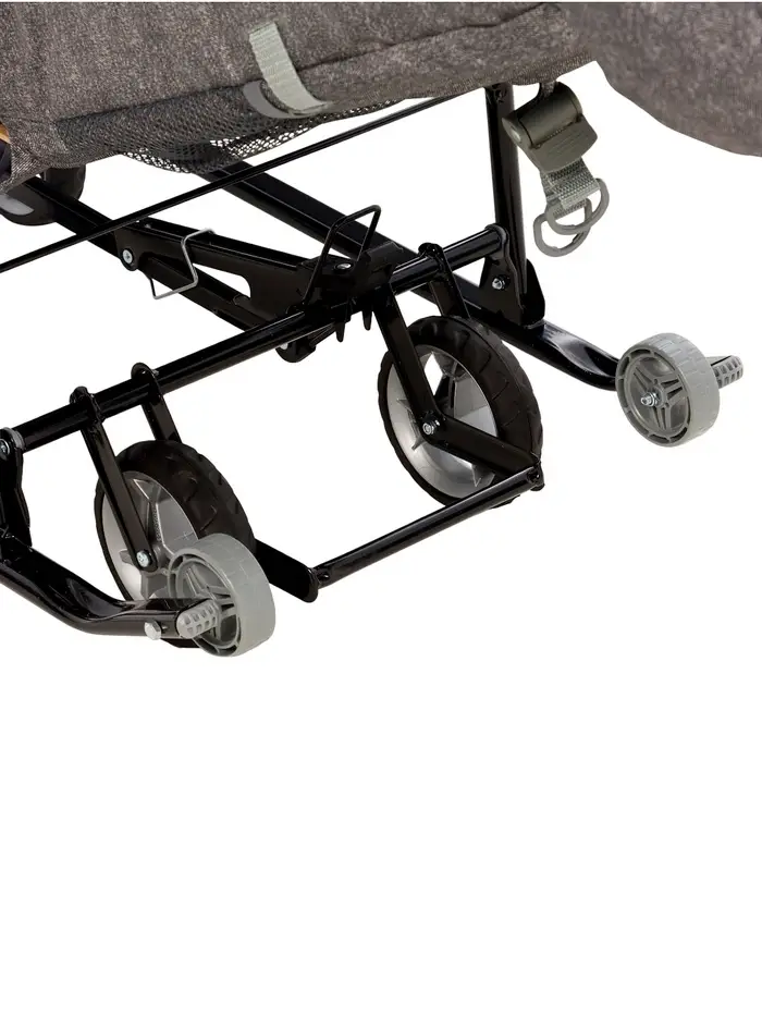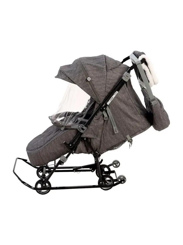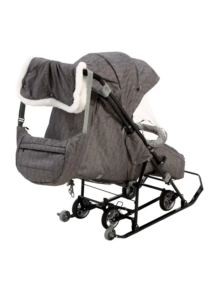 - Санки легко превращаются в коляску — выдвижные колёса и дополнительные ролики на полозьях позволяют кататься по разным поверхностям.