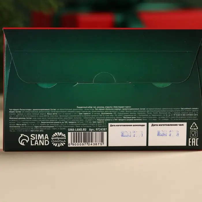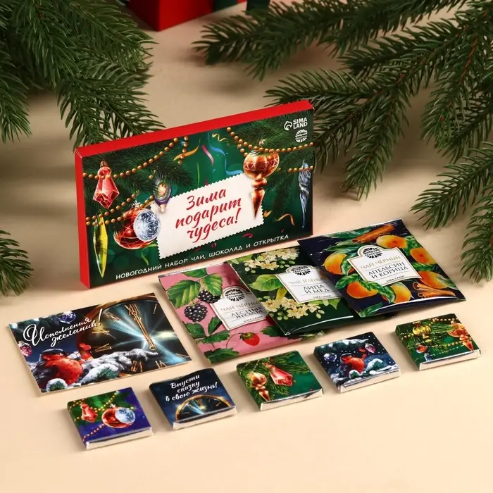 Подарочный набор «Зима подарит чудеса»: чай ассорти 5,4 г ( 3 шт. х 1,8 г)., молочный шоколад 25 г (5 шт. х 5 г)., открытка