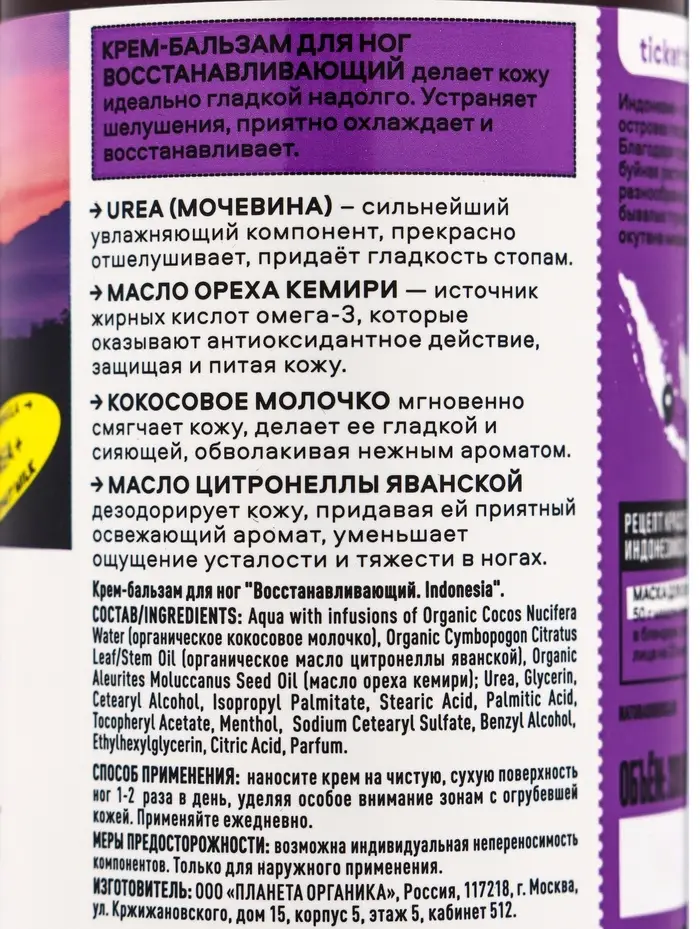 Восстанавливающий крем-бальзам для ног PLANETA ORGANICA создан для интенсивного ухода за уставшей и сухой кожей стоп. Благодаря комплексу натуральных экстрактов и масел средство глубоко питает, смягчает огрубевшие участки и способствует заживлению мелких трещинок.