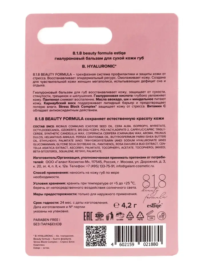 Бальзам для сухой кожи губ 818 beauty formula, гиалуроновый, 4.2 г