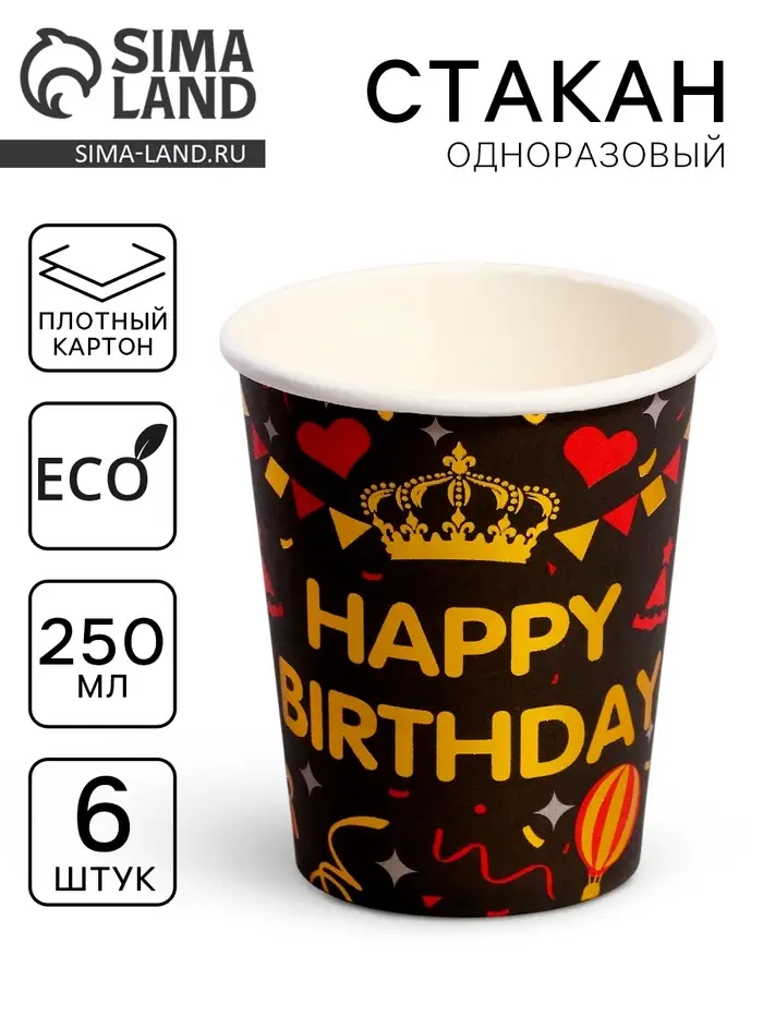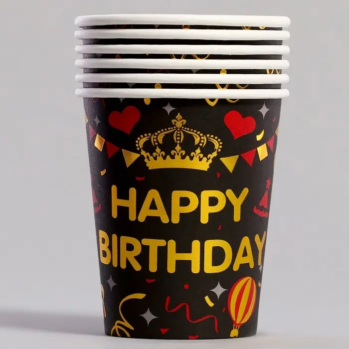 Стаканы бумажные «С Днём рождения!», 6 штук, цвет чёрный