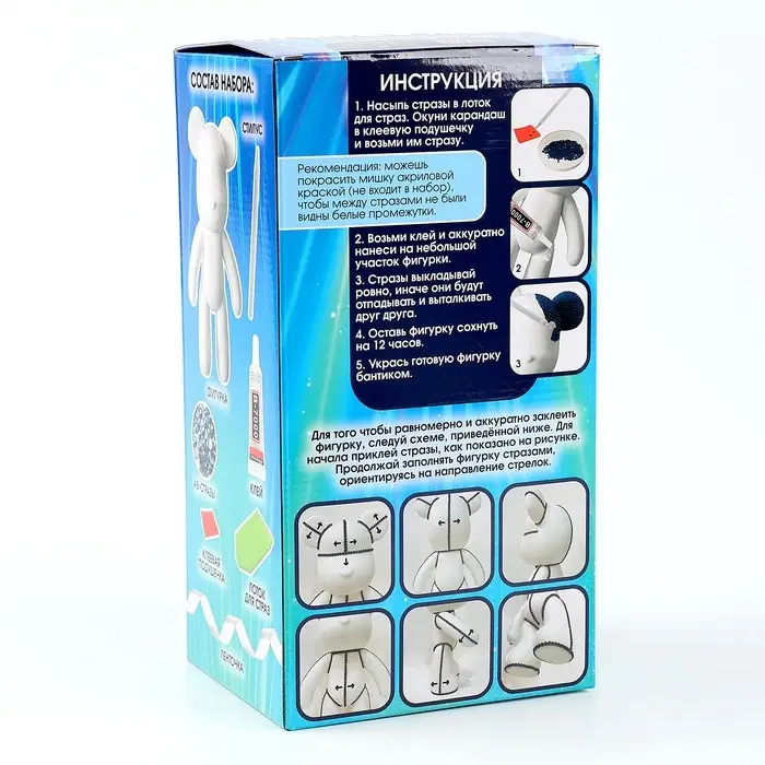 Набор позволит ребёнку смастерить сверкающую игрушку. Малыш с интересом создаст шедевр из ярких страз. Ему понравится не только результат работы, но и сам творческий процесс. Увлекательное занятие поможет развить мелкую моторику рук, усидчивость, внимательность и аккуратность.