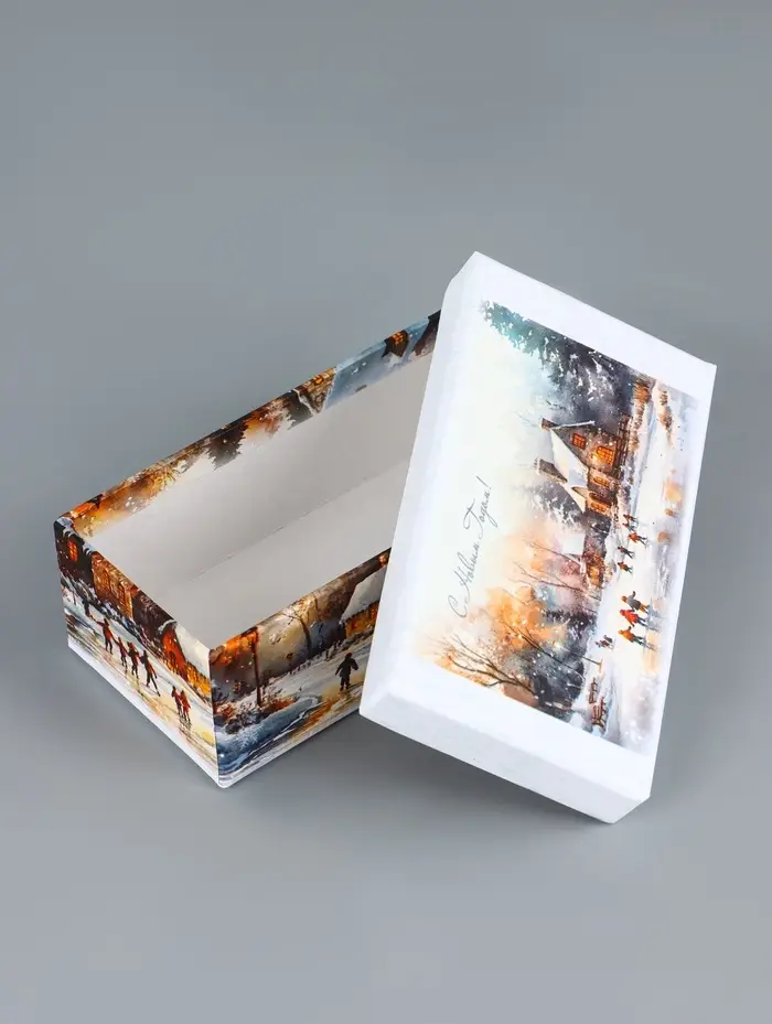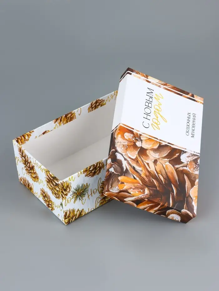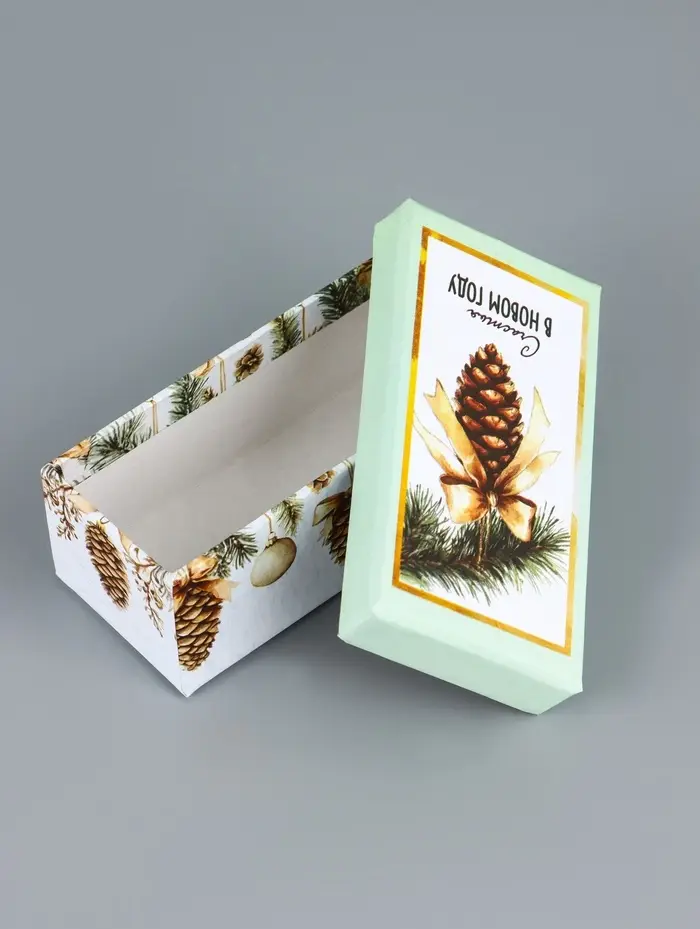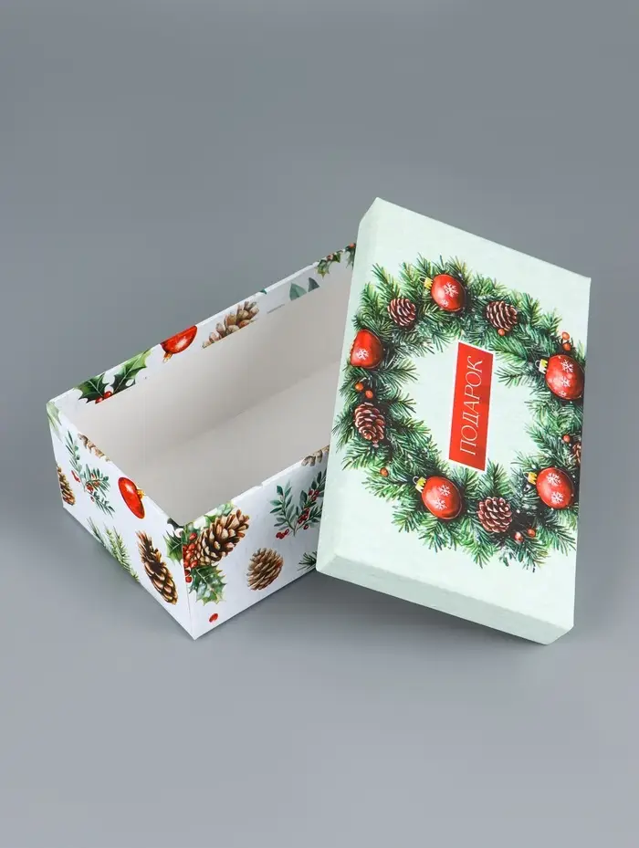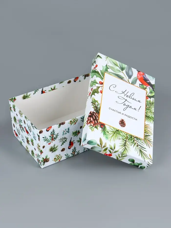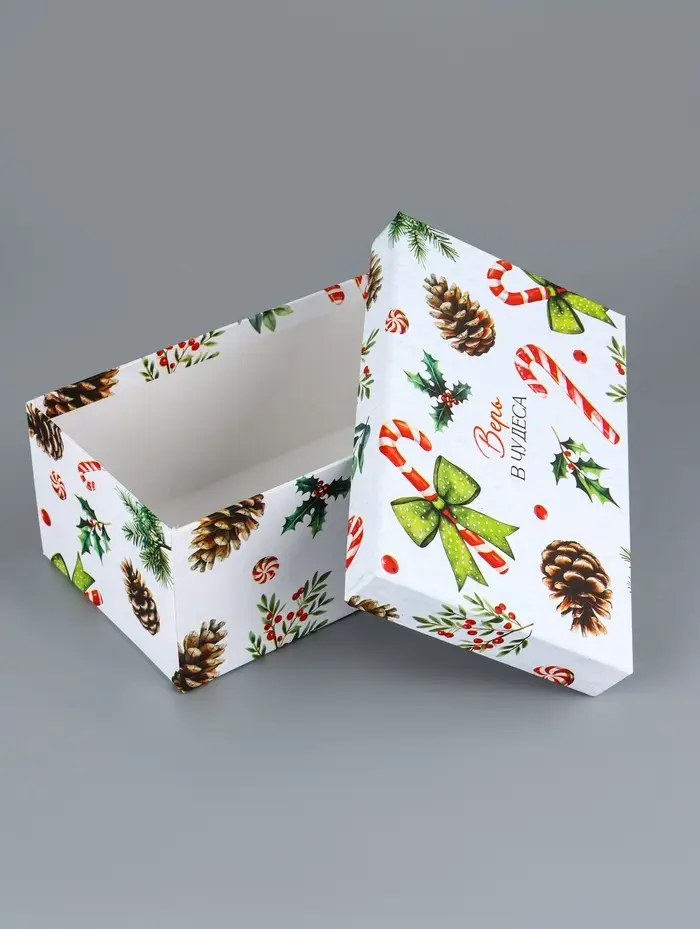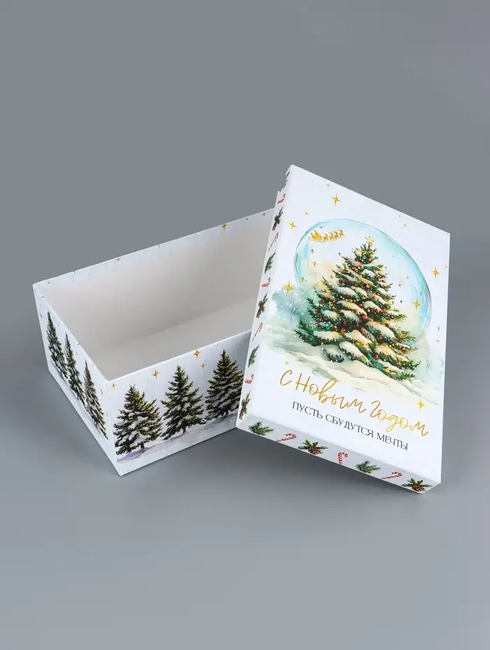- Прямоугольная форма: Удобно складывать подарки, экономично использовать пространство под елкой. Коробки легко собираются без дополнительных инструментов.
