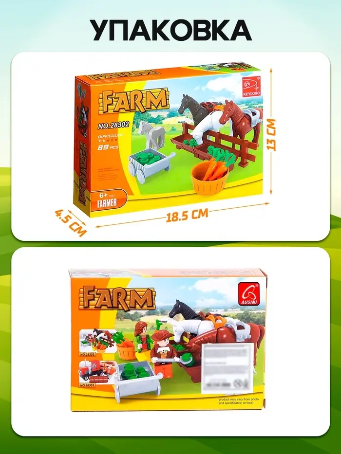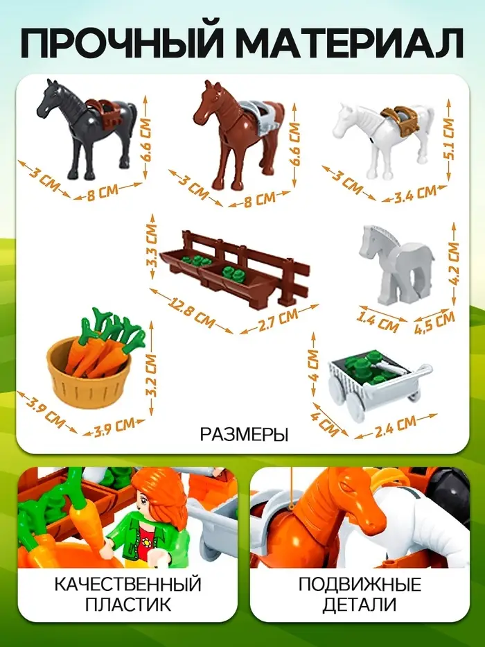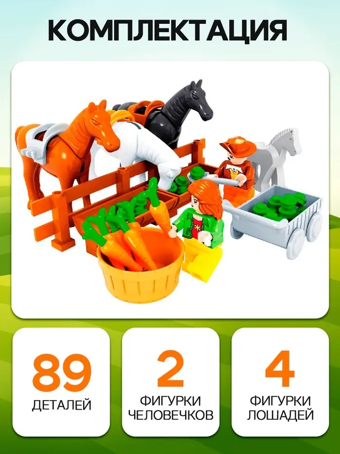 - Содержит 89 деталей для создания фермы с конюшней и фигурками фермеров.
