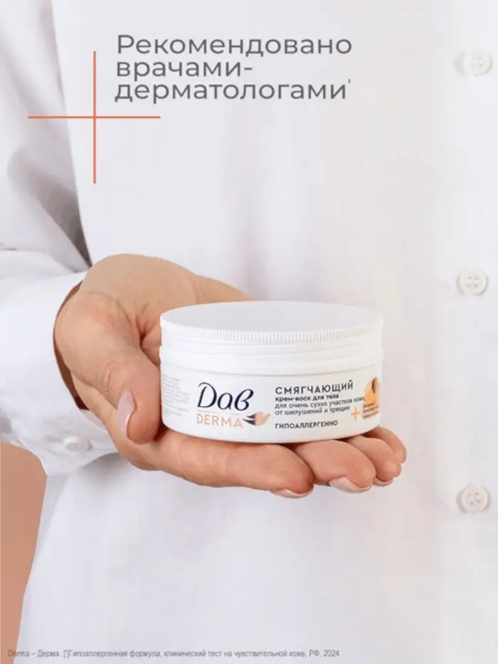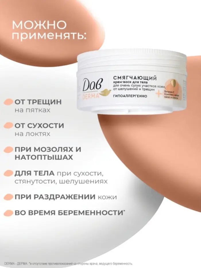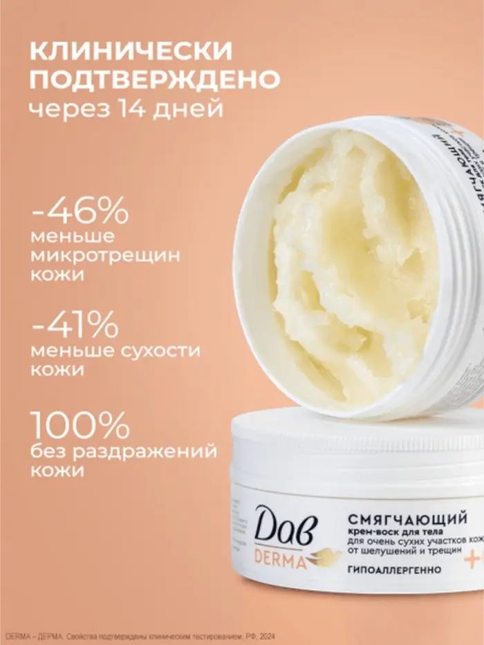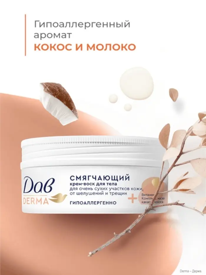 Увлажняющий крем-воск для тела Дав Derma смягчающий— это универсальное средство для ухода за очень сухой кожей. Продукт эффективно справляется с шелушениями и трещинами, восстанавливая красоту кожи.