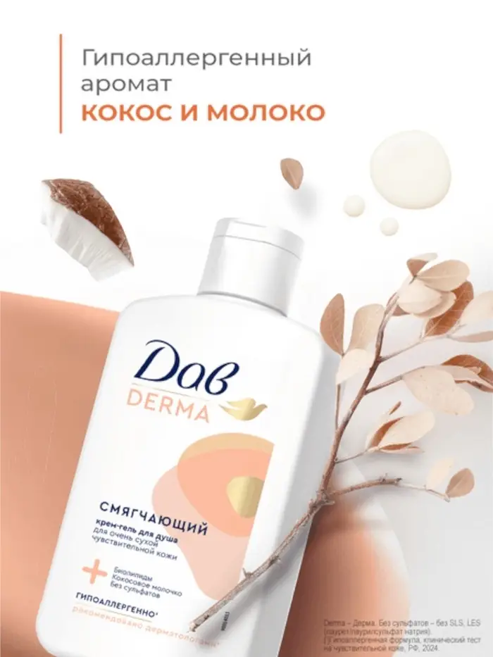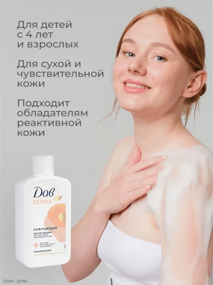 Гипоаллергенный смягчающий крем-гель для очень сухой чувствительной кожи Дав Derma – это идеальный выбор для ухода за кожей всей семьи.