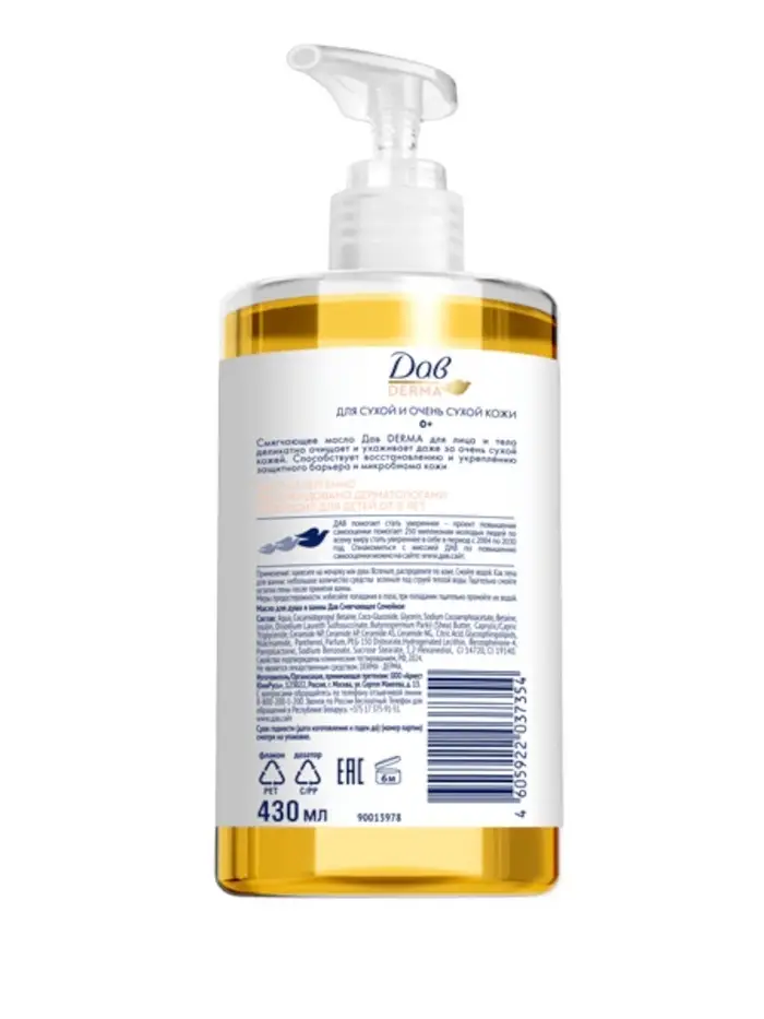 Масло для душа и ванны смягчающее "Дав" для сухой кожи, для всей семьи, 430 мл