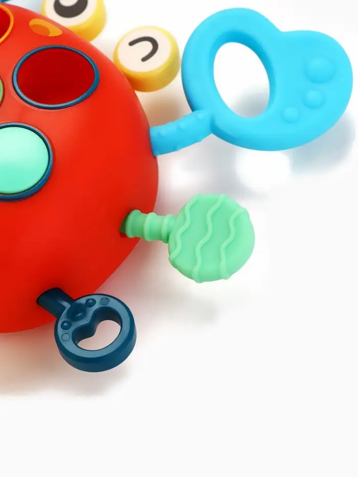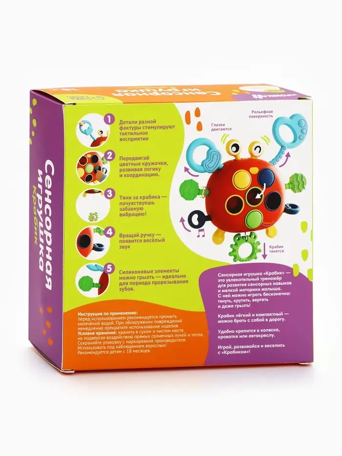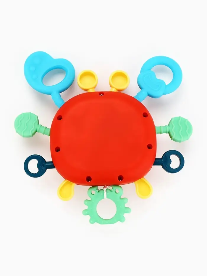 Крабик превращает игру в маленькое исследование. Он двигается, вибрирует, меняет детали местами и реагирует на каждое действие малыша. Игрушка помогает развивать внимание, ловкость и воображение, а мягкие вставки служат удобным прорезывателем в период появления первых зубов.