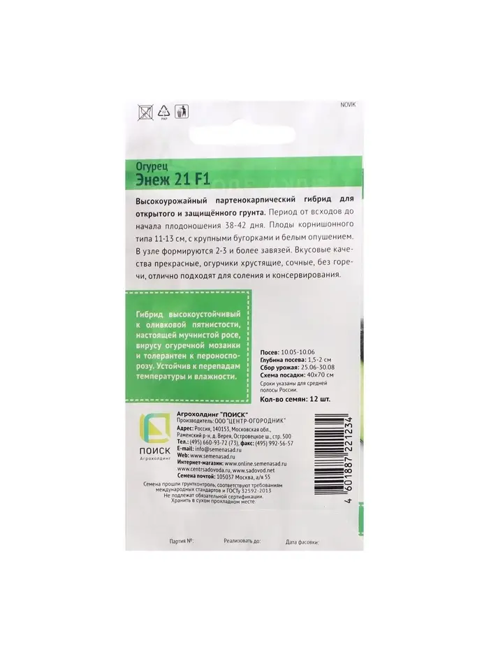 Высокоурожайный партенокарпический гибрид для открытого и защищённого грунта. Период от всходов до начала плодоношения 38-42 дня. Плоды корнишонного типа 11-13 см, скрупными бугорками и белым опушением. В узле формируются 2-3 и более завязей. Вкусовые качества прекрасные, огурчики хрустящие, сочные, без горечи, отлично подходят для соления и консервирования.