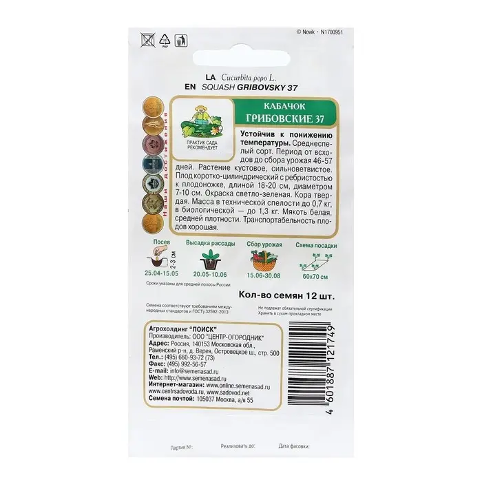 Устойчив к понижению температуры. Среднеранний сорт. Период от всходов до сбора урожая 46-57 дней. Растение кустовое, сильноветвистое. Плод короткоцилиндрический с ребристостью к плодоножке, длиной 18-20 см, диаметром 7-10 см. Окраска светло-зеленая. Кора твердая. Масса в технической спелости до 1 кг, в биологической - до 2-3 кг. Мякоть белая, средней плотности. Транспортабельность плодов хорошая. Сорт устойчив к понижению температуры.
