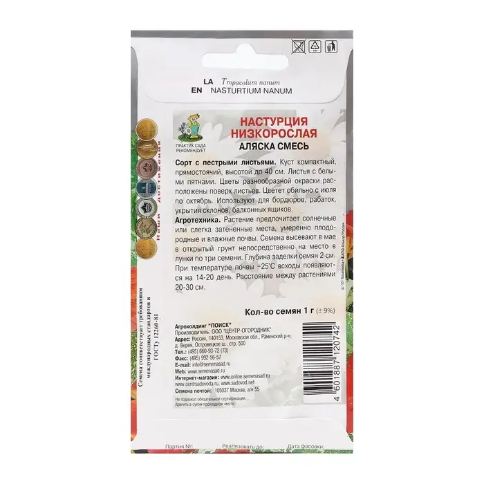 Семена цветов Настурция низкорослая "Аляска смесь" 1 г