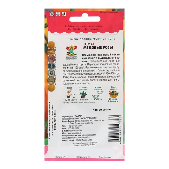 Томат Медовые росы - насыщенно оранжевый салатный томат с выдающимся вкусом. Среднеспелый сорт для пленочных теплиц. Период от всходов до созревания 115-120 дней. Растение высокорослое, требует формирования и подвязки. Плоды округлой или слегка плоскоокруглой формы, массой до 450 г. Очень вкусные, яркие, мясистые. Уникальный оранжевый цвет мякоти высоко ценится для приготовления супов и соусов. Стимулятор плодообразования ТОМАТОН - гарантия высокого урожая при любых неблагоприятных условиях роста.