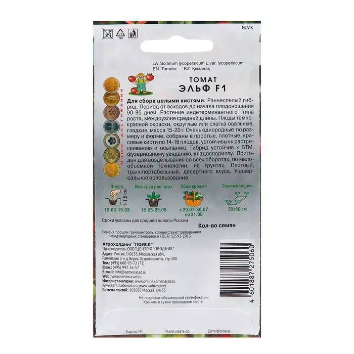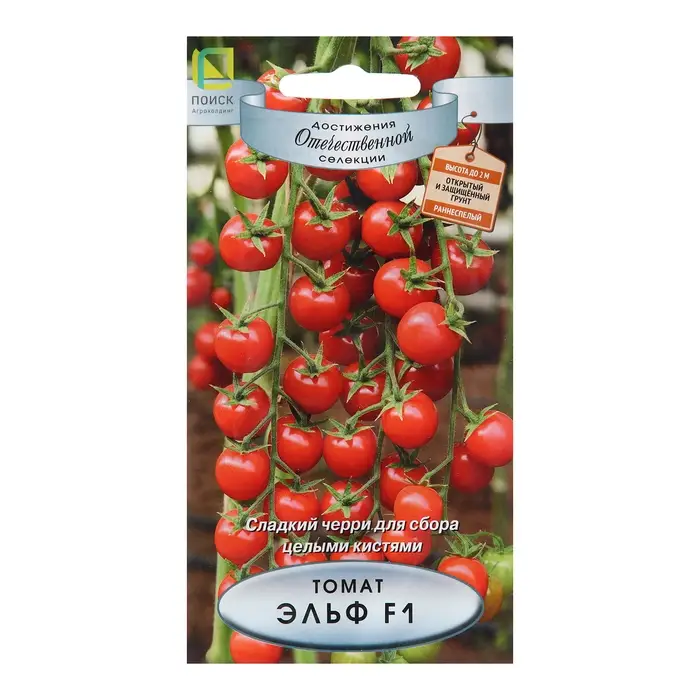 Томат Эльф F1 - раннеспелый, отличные вкусовые качества, пригоден для уборки урожая кистями• Раннеспелый (85-90 дней), компактный габитус, с укороченными междоузлиями• Масса плода 20-25 г• Плоды округлые, гладкие, плотные, собраны в красивую плотную, прочную кистьпо 12-15 штук, пригодны для реализации на подложке• Зрелые плоды темно-красной окраски (ликопин 7,9 мг/100 г), с глянцевым блеском,отличные вкусовые качества• Урожайность 5,5-6,0 кг/м2 (на светокультуре до 15 кг/м2)• Устойчив к ВТМ, фузариозному увяданию, кладоспориозу, растрескиванию иосыпанию;• Рекомендуется для потребления в свежем виде и цельноплодного консервирования