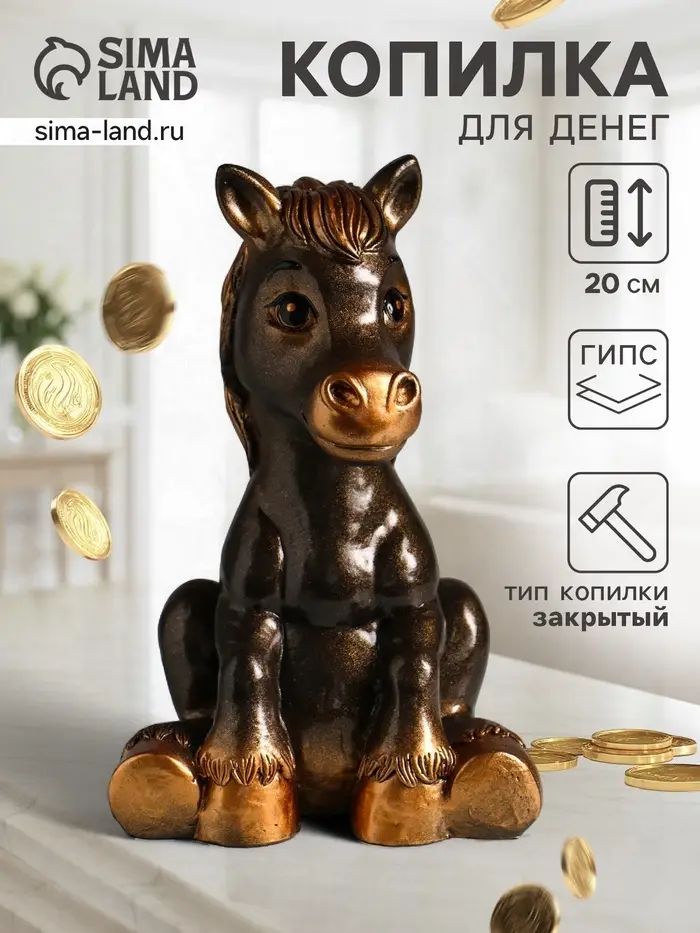 Эта копилка в виде лошади — не просто сувенир, а верный талисман для ваших финансов. Солидная гипсовая фигура станет значимым подарком на Новый 2026 год, день рождения или для создания личного денежного ритуала. Закрытый тип конструкции помогает откладывать деньги осознанно, превращая каждую монету в шаг к большой цели.