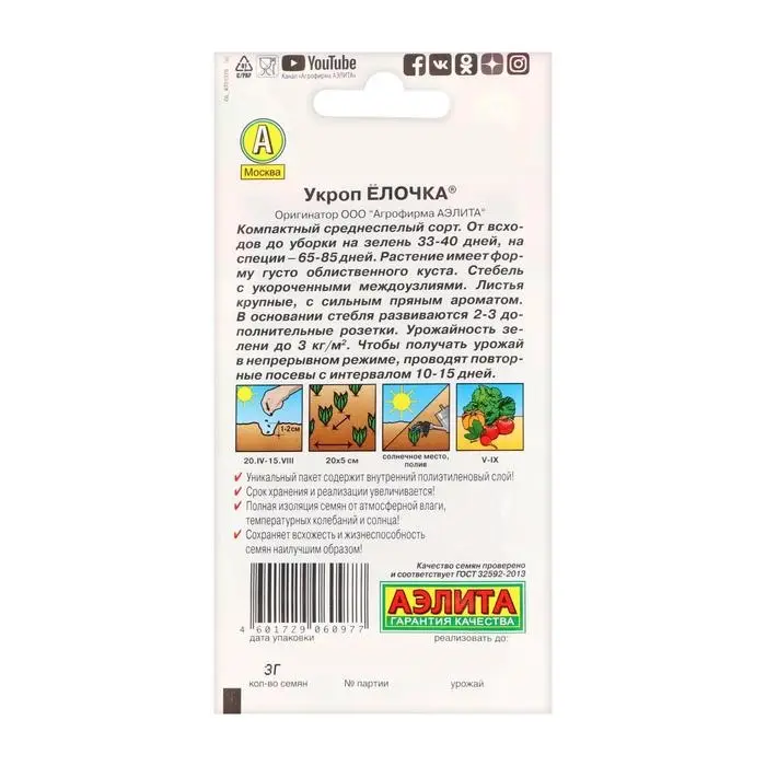 «Ёлочка» представляет собой среднеспелый сорт укропа. Растение имеет крупные листья с сильным пряным ароматом. Подходит для сушки, соления, замораживания, употребления в сыром виде. Семена имеют насыщенный аромат, хороши в качестве специй для засолки огурцов, капусты.