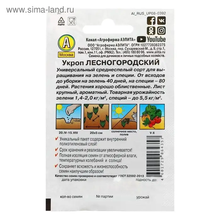 Семена Укроп "Лесногородский" "Лидер", 2 г ,