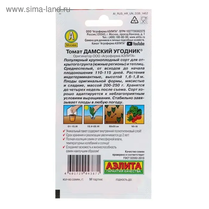 Как сажать. Семена сеют на рассаду в марте. Пикируют в фазе 1–2 настоящих листьев. Посадка рассады: в середине мая — под плёнку, в начале июня — в открытый грунт. Возраст рассады — 60–65 дней (в фазе 5–7 настоящих листьев). Схема посадки: 60 × 50 см.