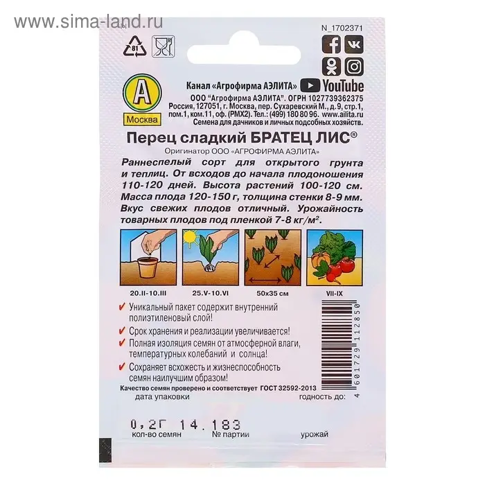 Благодаря внутреннему полиэтиленовому слою пакет не пропускает влагу и увеличивает срок годности семян до 2-ух лет.