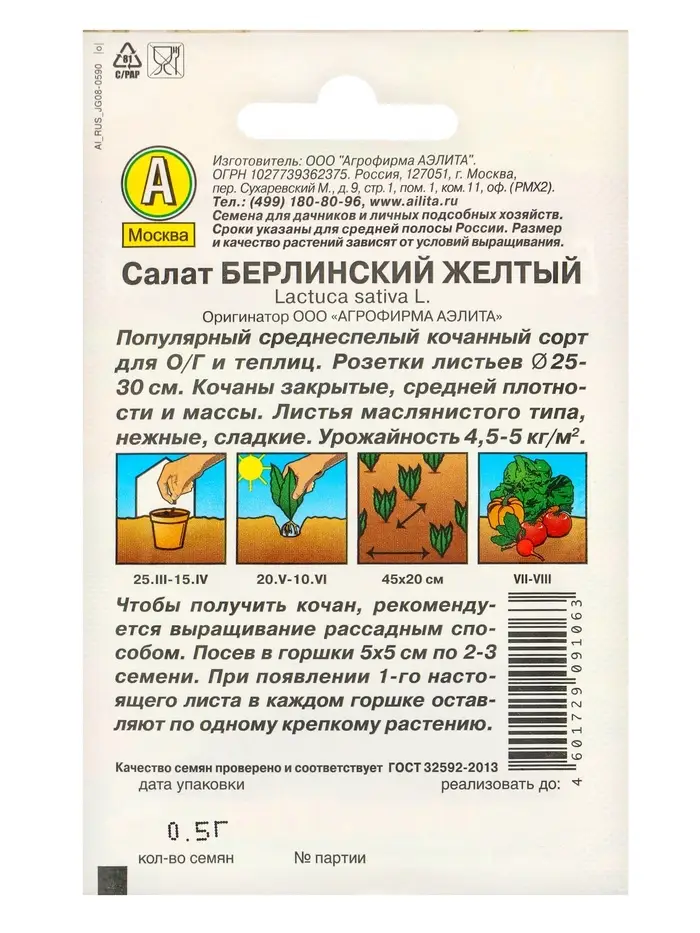 Семена Салат Берлинский желтый кочанный "Лидер", 0,5 г ,