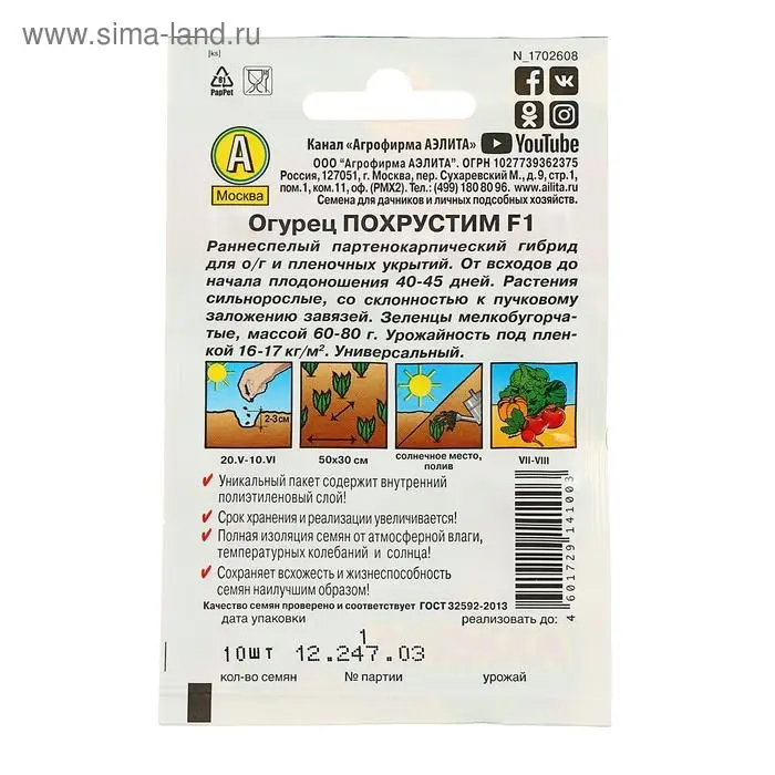 Семена Огурец "Похрустим" "Лидер", F1, 10 шт,