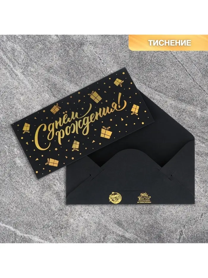 Конверт для денег «С днем рождения», на черном крафте, тиснение, 16.5×8 см