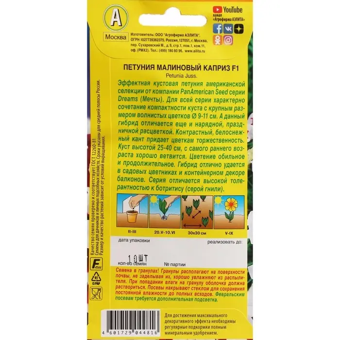 Посев на рассаду с февраля до середины марта. Чем раньше посеяны семена, тем раньше наступает цветение. Февральским посевам требуется дополнительная подсветка. Семена в драже прорастают на свету! Сеют поверхностно, без заделки, под стекло или пленку для сохранения постоянной влажности. Всходы появляются на 5-6 день. Пикировка в фазе 1-2-х настоящих листьев. Высадка в грунт закаленной рассады в конце мая, с шагом 20-25см. Петуния – культура сравнительно неприхотливая, очень пластичная, хорошо адаптируется к любым условиям.
