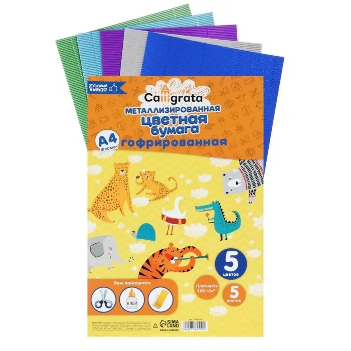 Набор бумаги гофрированной, формат А4, 5 листов, 5 цветов, плотность 160г/м2, МЕТАЛЛИК