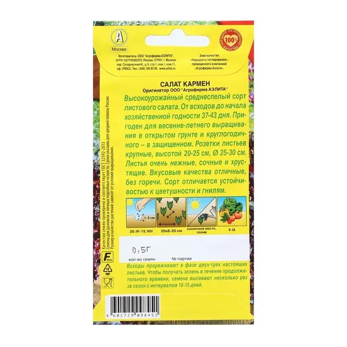 Высокоурожайный среднеспелый сорт листового салата. Период от всходов до начала хозяйственной годности 37-43 дня. Пригоден для весенне-летнего выращивания в открытом грунте, и круглогодичного – в защищенном. Розетка листьев крупная, высотой 20-25 см, Ø25-30 cм, массой 210- 270 г. Листья с сильной антоциановой окраской, очень нежные, сочные и хрустящие. Вкусовые качества отличные, без горечи. Сорт отличается быстрым ростом при любой длине дня, устойчивостью к цветушности и гнилям, долго сохраняет прекрасные хозяйственные качества. Урожайность 2,1-2,5 кг/м2.