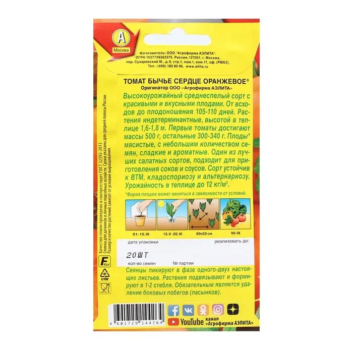 Семена Томат «Бычье сердце оранжевое», индетерминантный, высокорослый, 20 шт., «АЭЛИТА»