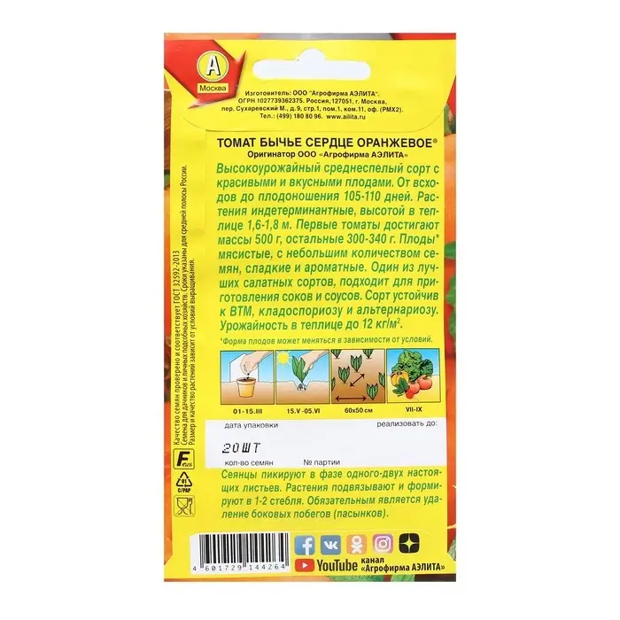 Семена Томат "Бычье сердце оранжевое", индетерминантный,высокорослый, 20 шт