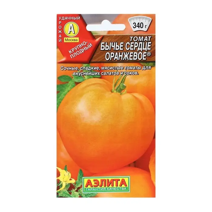 Популярный крупноплодный сорт с характерной ярко-оранжевой окраской плодов. Среднеспелый. Растение индетерминантное, среднеоблиственное. Плоды массой до 400 г, слаборебристые, многокамерные, мясистые, сладкие, с превосходными вкусовыми качествами. Окраска зрелого плода – оранжевая. Пригоден для выращивания в открытом и защищенном грунте. Салатного назначения.